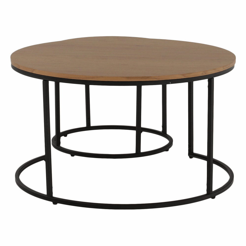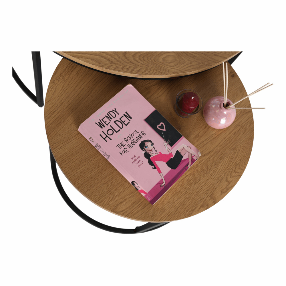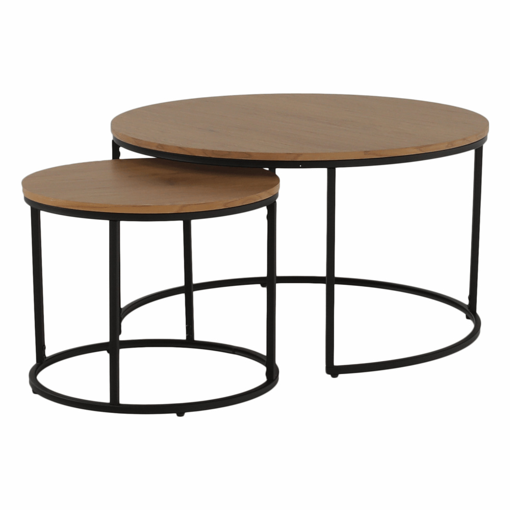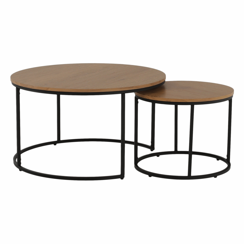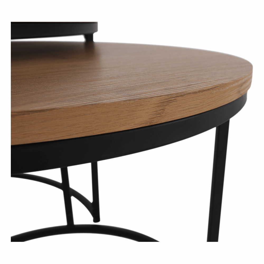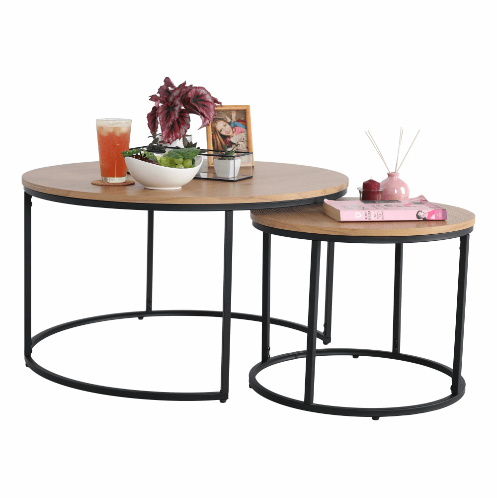 Set dvou konferenčních stolků IKLIN Materiál: MDF / kov Barevné provedení: dub / černý kov Rozměry větší (průměr x V): 80x45 cm Rozměry menší (průměr x V): 50x40 cm Nosnost: 30 kg Dodávané v demontu.
