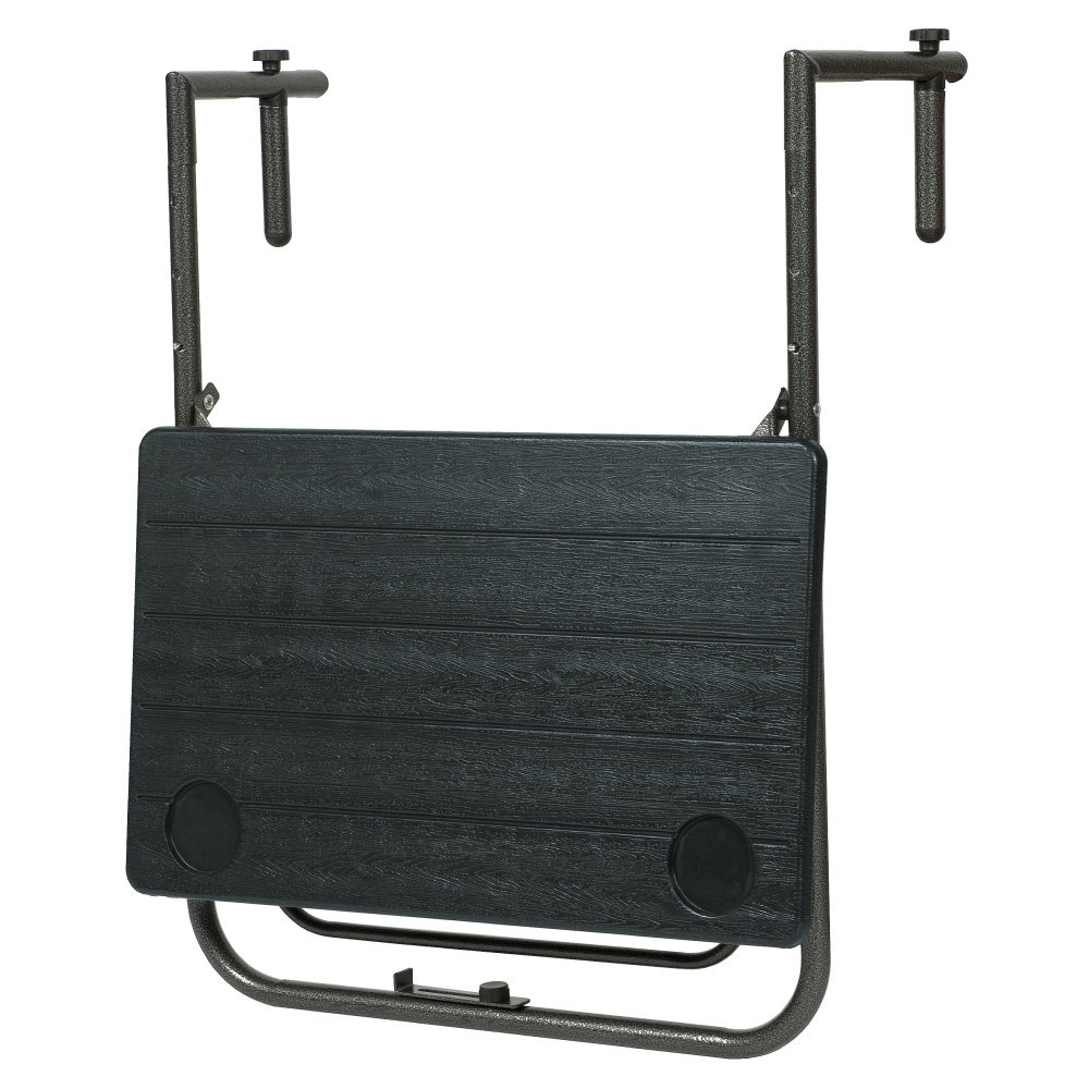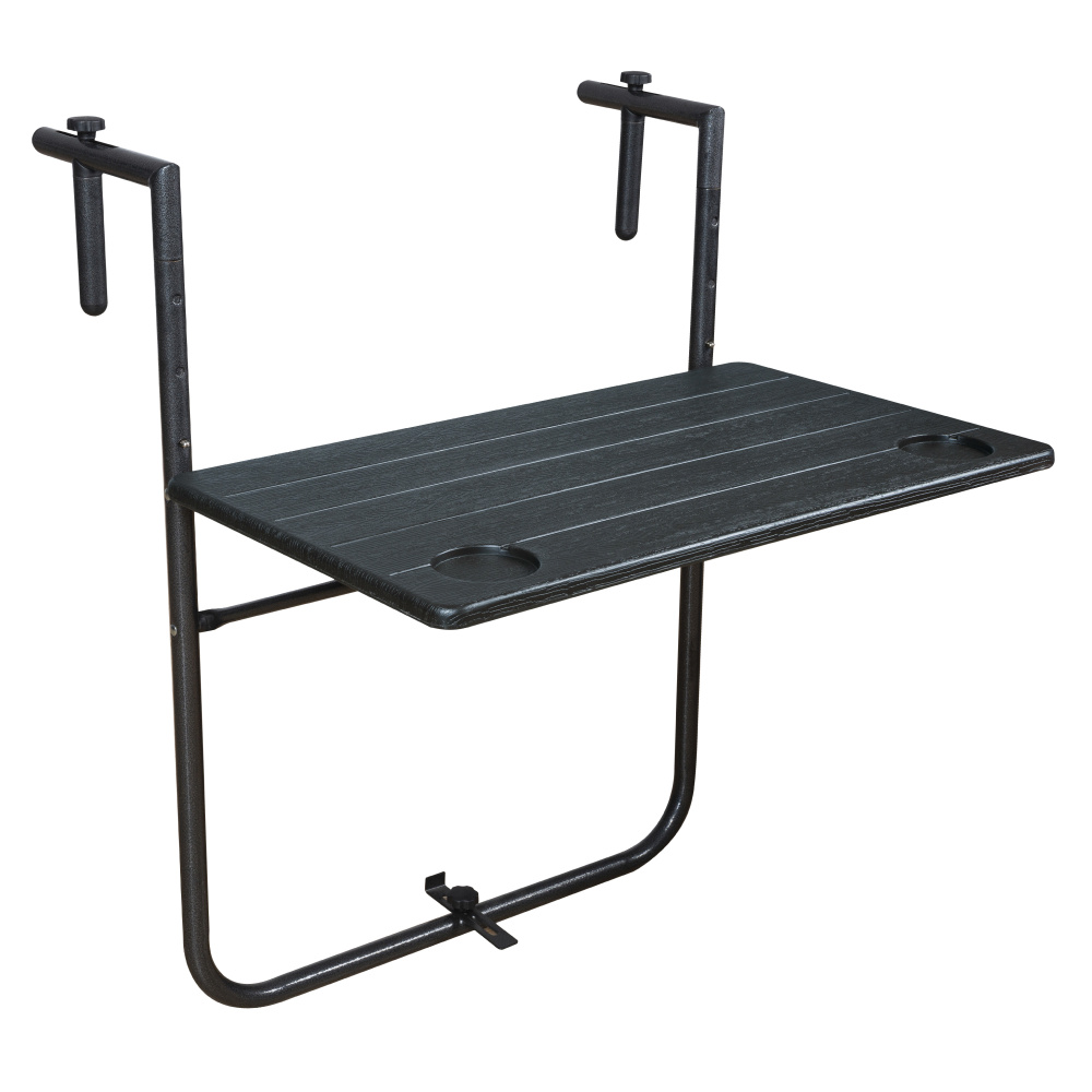 Materiál: ocel/plast Rozměry (ŠxHxV): 60x61x83,5 cm Barva: černá Rozměry stolní desky (ŠxH): 60x36 cm Tloušťka stolní desky: 3,7 cm Tloušťka konstrukce: 1,2 - 2,2 cm Skládací Úspora místa Rozměry ve složeném stavu (ŠxHxV): 60x83,5x22 cm Doporučená šířka zábradlí: 6,4 - 14,5 cm Výškově nastavitelný Nosnost: 50 kg 2 držáky na sklenice Vhodný na balkony, terasy nebo místa s omezeným prostorem Dodáváno v demontu