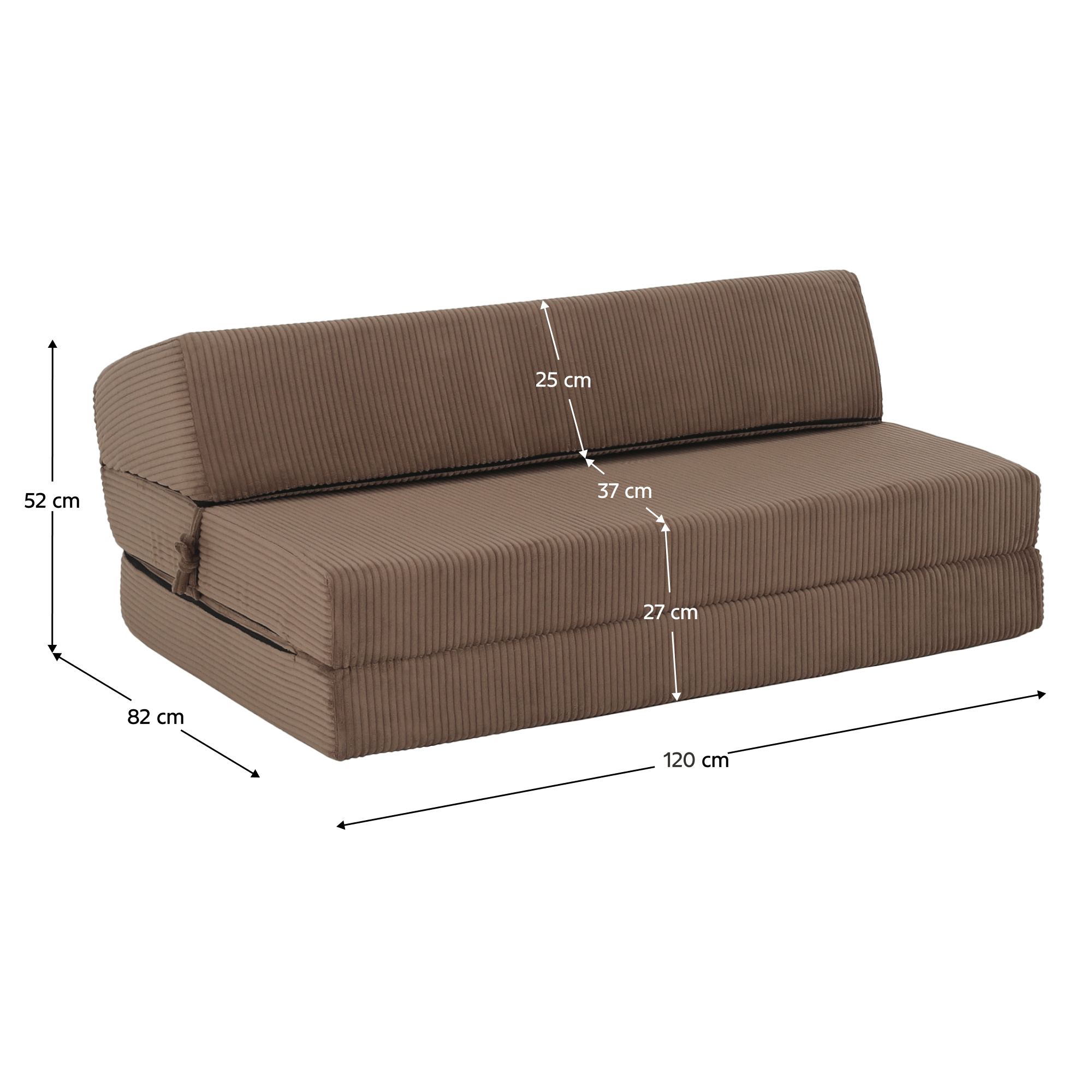 Materiál: polyuretanová pěna/látka Lincoln 17 Oděruodolnost textilie podle testu Martindale: 100 000 oděrů Barva: světle hnědá Rozměry (ŠxHxV): 120x82x52 cm Rozkládací Plocha na spaní (ŠxD): 120x200 cm Výška matrace ve složeném stavu: 27 cm Výška matrace v rozloženém stavu: 13 cm Nosnost na osobu: 120 kg Tvrdost matrace: T25 středně tvrdá pěna Křeslo Skládací matrace Profilovaná opěrka s jemným sklonem Se zipem Snímatelný potah Pratelný při 30 stupních Dodáváno v monte