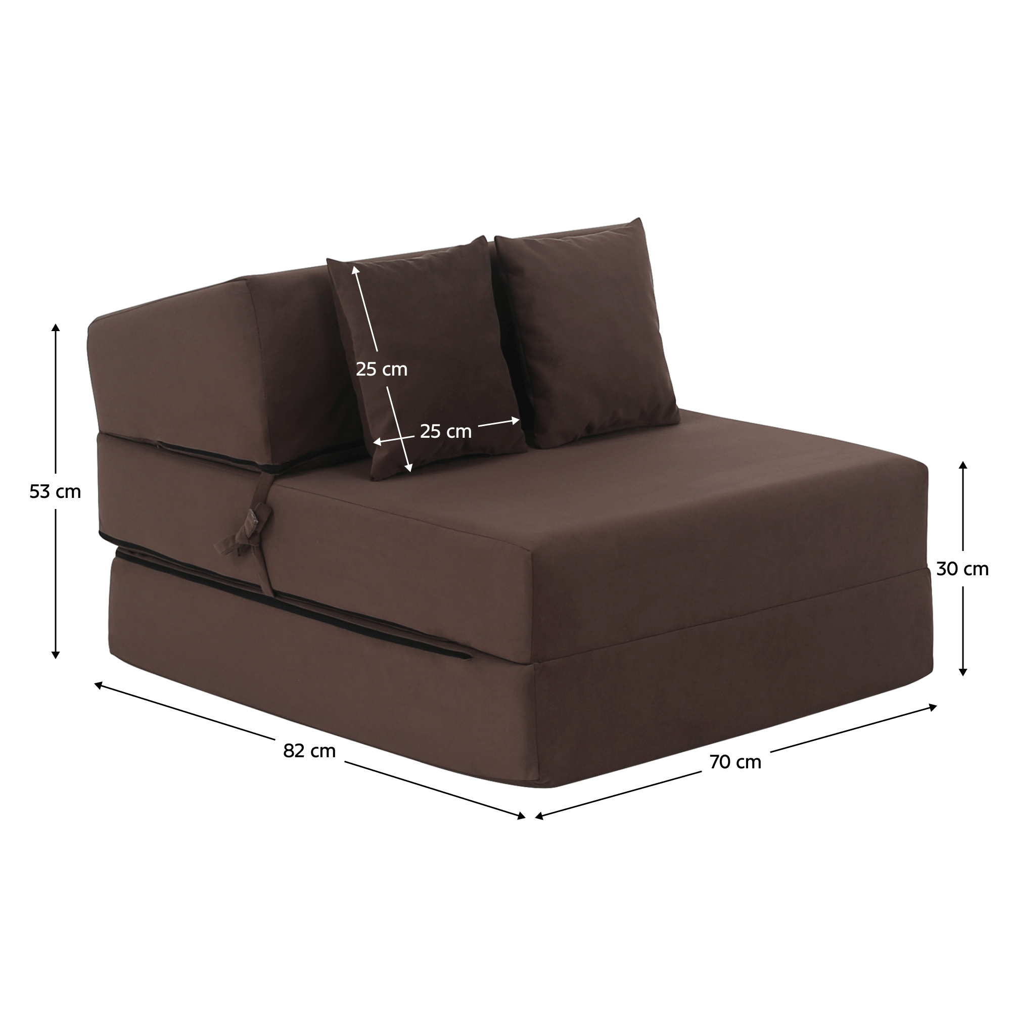 Materiál: polyuretanová pěna/látka Trinity 06 Oděruodolnost textilie podle testu Martindale: 55 000 oděrů Barva: hnědá taupe Rozměry (ŠxHxV): 70x82x53 cm Rozkládací Plocha na spaní (ŠxD): 70x200 cm Výška matrace ve složeném stavu: 30 cm Výška matrace v rozloženém stavu: 15 cm Nosnost na osobu: 120 kg Tvrdost matrace: T25 středně tvrdá pěna Křeslo Skládací matrace Profilovaná opěrka s jemným sklonem Se zipem Snímatelný potah Pratelný při 30 stupních Dodáváno s polštáři Rozměry polštářů (ŠxV): 25x25 cm Dodáváno v monte