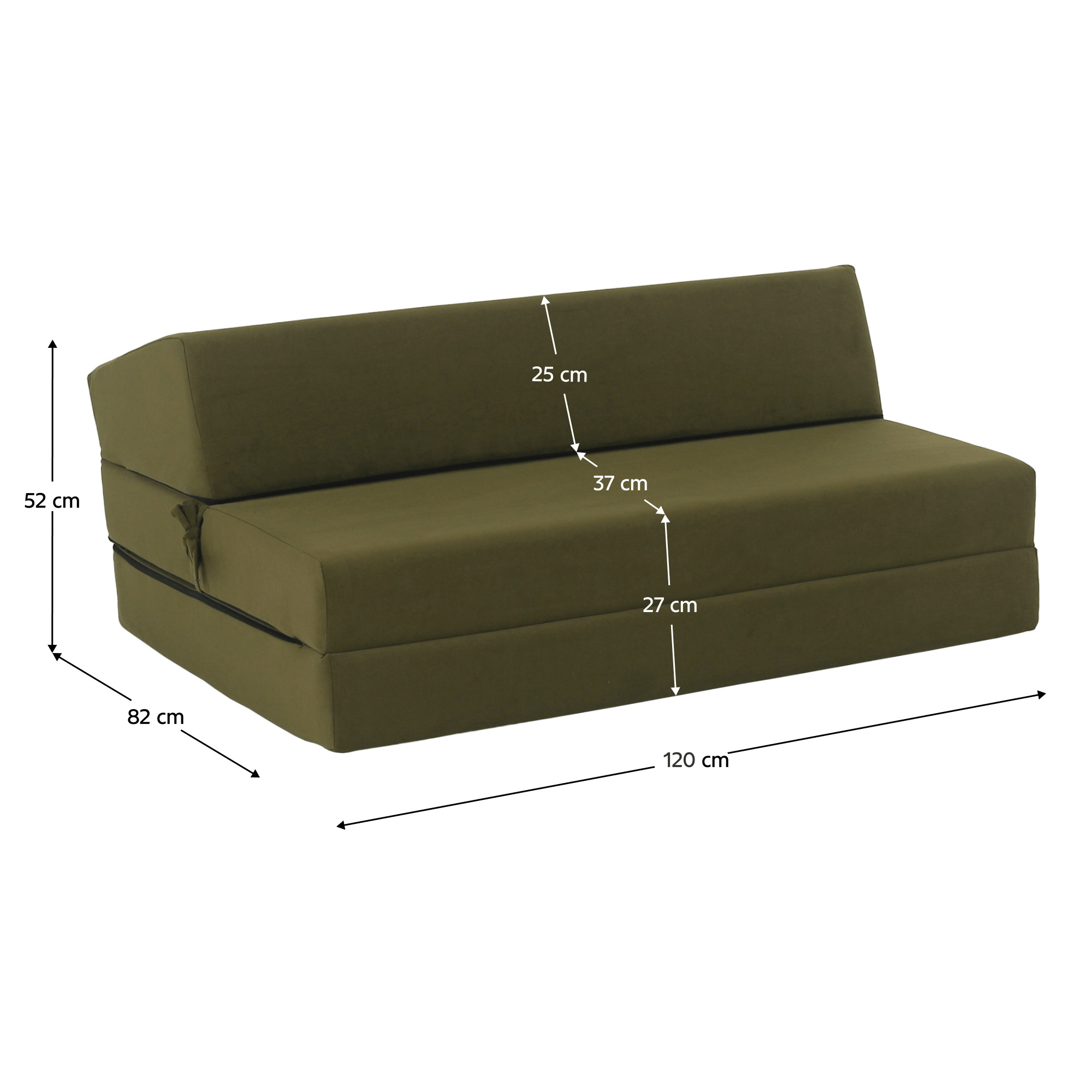 Materiál: polyuretanová pěna/látka Trinity 27 Oděruodolnost textilie podle testu Martindale: 55 000 oděrů Barva: olivová Rozměry (ŠxHxV): 120x82x52 cm Rozkládací Plocha na spaní (ŠxD): 120x200 cm Výška matrace ve složeném stavu: 27 cm Výška matrace v rozloženém stavu: 13 cm Nosnost na osobu: 120 kg Tvrdost matrace: T25 středně tvrdá pěna Křeslo Skládací matrace Profilovaná opěrka s jemným sklonem Se zipem Snímatelný potah Pratelný při 30 stupních Dodáváno v monte