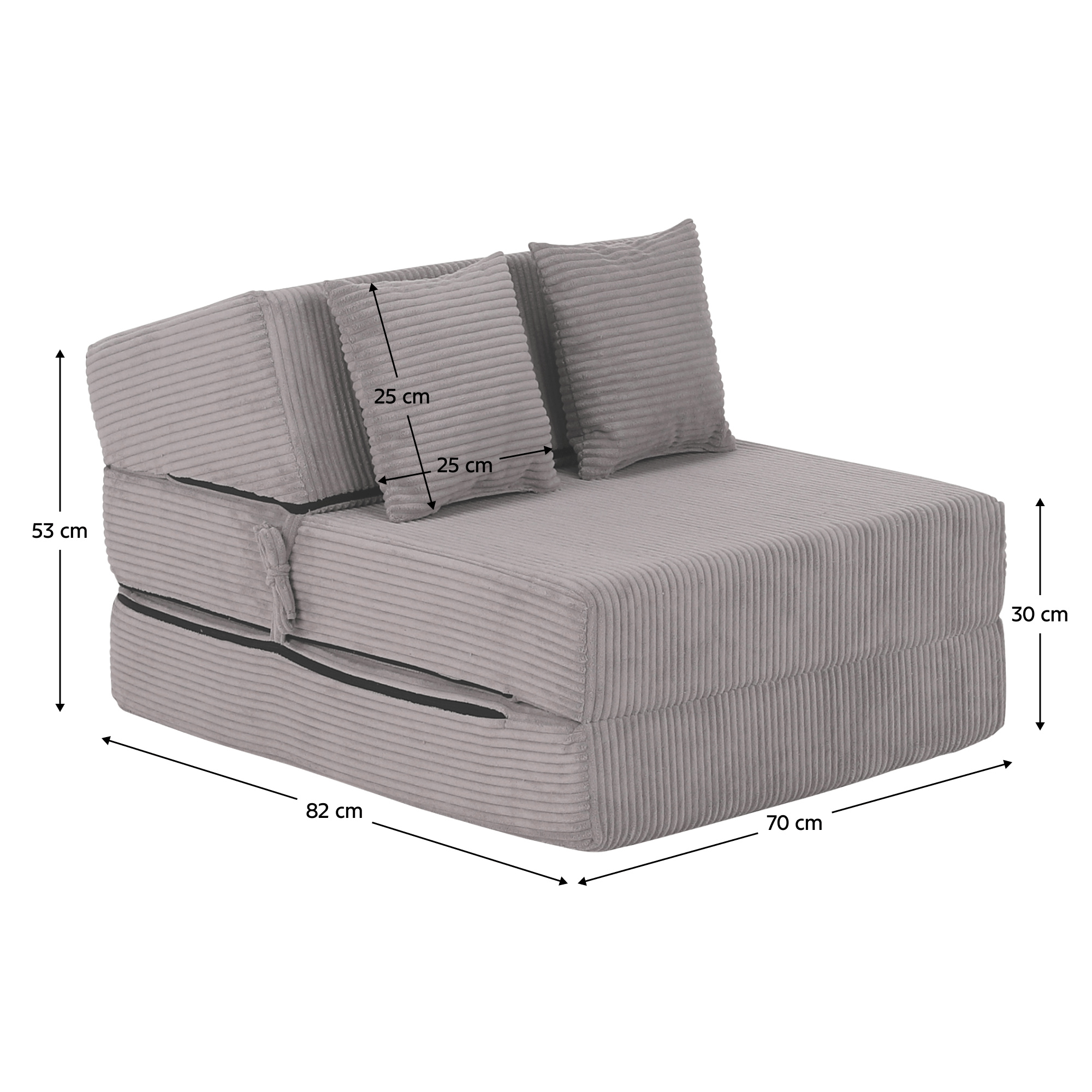 Materiál: polyuretanová pěna/látka Lincoln 86 Oděruodolnost textilie podle testu Martindale: 100 000 oděrů Barva: šedá Rozměry (ŠxHxV): 70x82x53 cm Rozkládací Plocha na spaní (ŠxD): 70x200 cm Výška matrace ve složeném stavu: 30 cm Výška matrace v rozloženém stavu: 15 cm Nosnost na osobu: 120 kg Tvrdost matrace: T25 středně tvrdá pěna Křeslo Skládací matrace Profilovaná opěrka s jemným sklonem Se zipem Snímatelný potah Pratelný při 30 stupních Dodáváno s polštáři Rozměry polštářů (ŠxV): 25x25 cm Dodáváno v monte