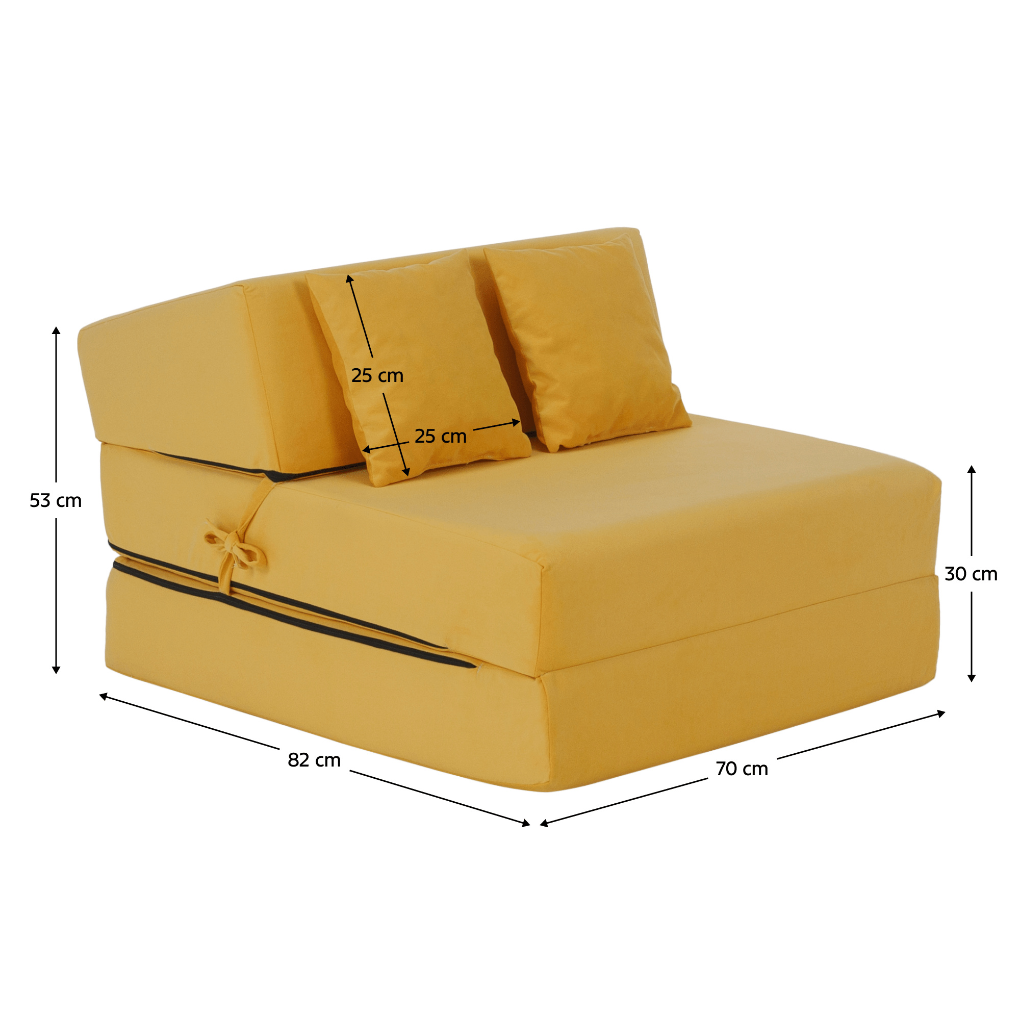 Materiál: polyuretanová pěna/látka Trinity 18 Oděruodolnost textilie podle testu Martindale: 55 000 oděrů Barva: žlutá Rozměry (ŠxHxV): 70x82x53 cm Rozkládací Plocha na spaní (ŠxD): 70x200 cm Výška matrace ve složeném stavu: 30 cm Výška matrace v rozloženém stavu: 15 cm Nosnost na osobu: 120 kg Tvrdost matrace: T25 středně tvrdá pěna Křeslo Skládací matrace Profilovaná opěrka s jemným sklonem Se zipem Snímatelný potah Pratelný při 30 stupních Dodáváno s polštáři Rozměry polštářů (ŠxV): 25x25 cm Dodáváno v monte