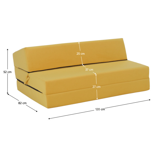 Materiál: polyuretanová pěna/látka Trinity 18 Oděruodolnost textilie podle testu Martindale: 55 000 oděrů Barva: žlutá Rozměry (ŠxHxV): 120x82x52 cm Rozkládací Plocha na spaní (ŠxD): 120x200 cm Výška matrace ve složeném stavu: 27 cm Výška matrace v rozloženém stavu: 13 cm Nosnost na osobu: 120 kg Tvrdost matrace: T25 středně tvrdá pěna Křeslo Skládací matrace Profilovaná opěrka s jemným sklonem Se zipem Snímatelný potah Pratelný při 30 stupních Dodáváno v monte