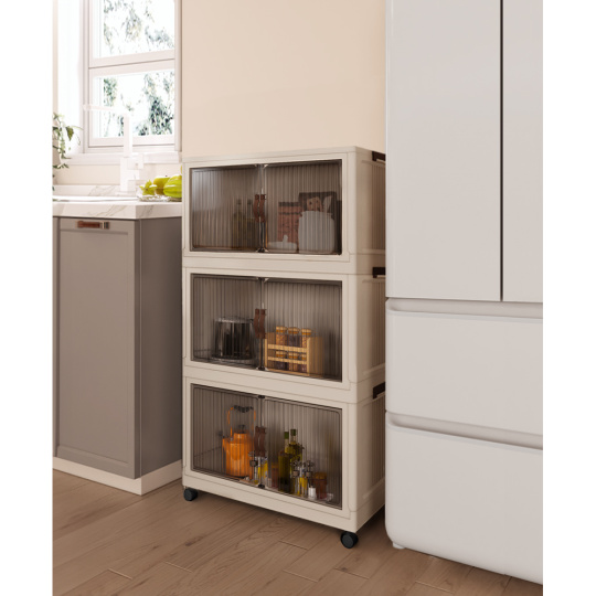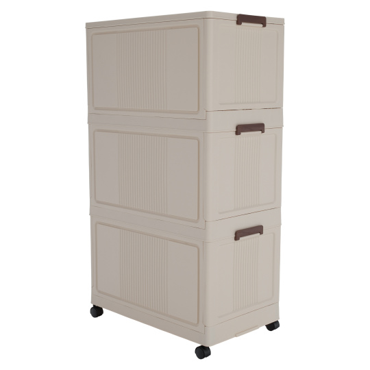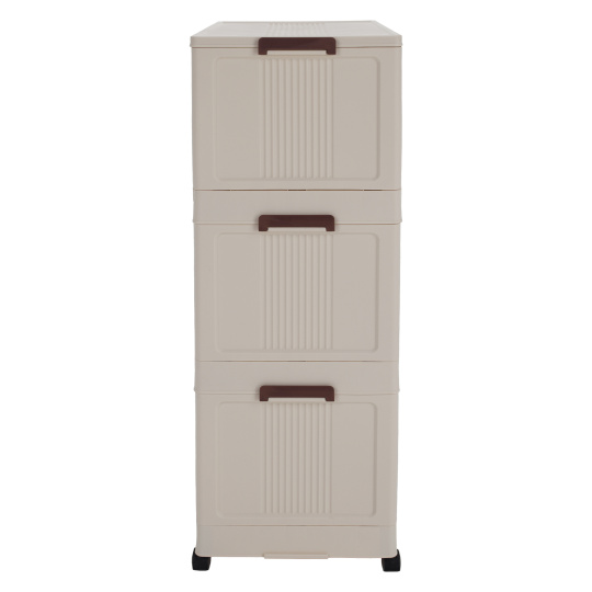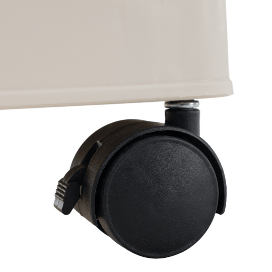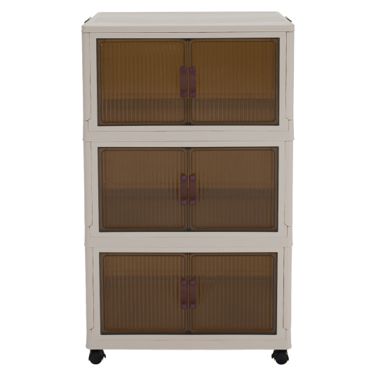 Materiál: plast Barva: bílá/hnědá Rozměry (ŠxHxV): 60,5x38x103,5 cm Vroubkovaná dvířka 3x úložný prostor Nosnost na polici: 10 kg Pojízdný Na kolečkách Čtyři kolečka Otočné Kolečka s brzdami Moderní design Dodáváno v demontu