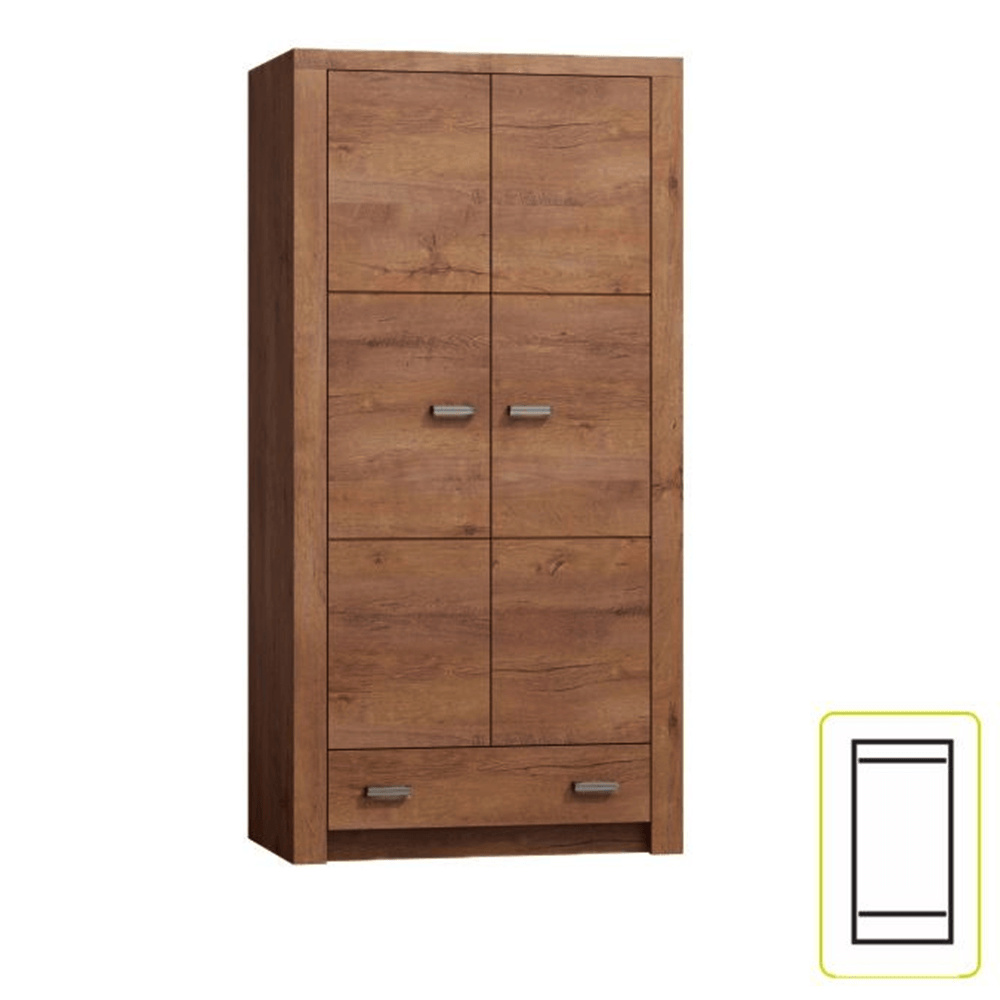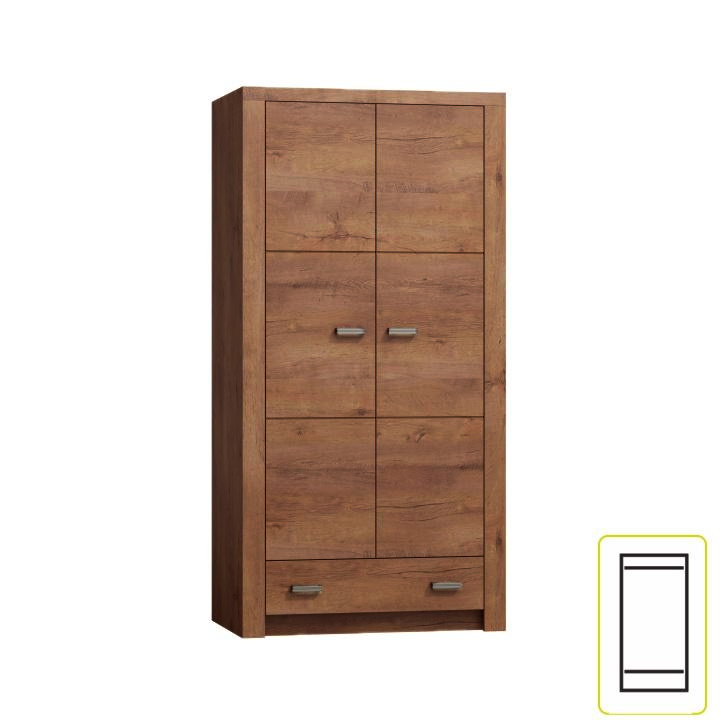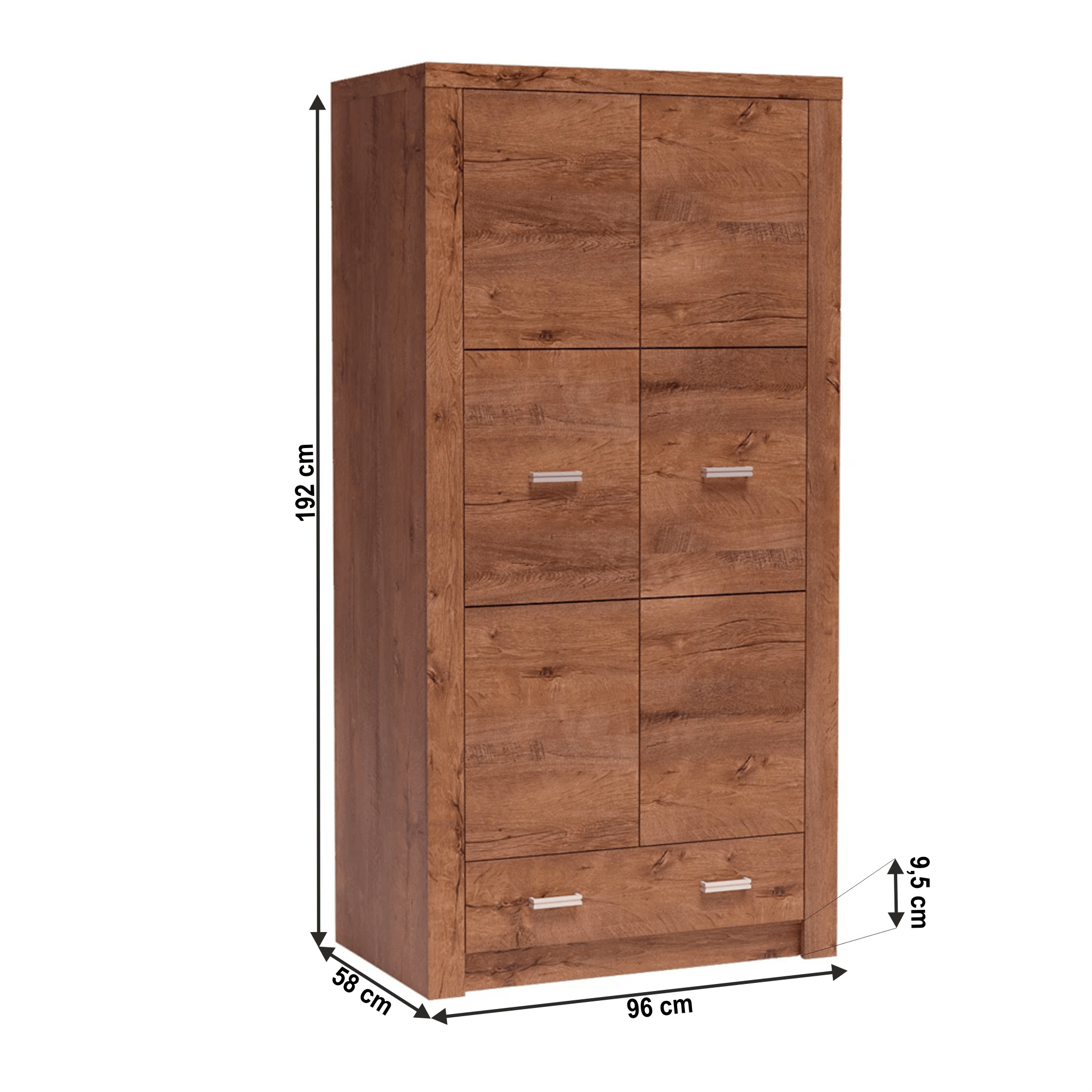 Skříň 01 z luxusního sektorového nábytku Korpus hrubý až 48 mm.Tloušťka materiálu zbývající části: 16 mm, úchytky kovové Materiál DTD laminovaná, ABS hrany, Barevné provedení: jasan světlý Rozměry ŠxHxV: 96x58x192 cm. Dodávané v demontu.