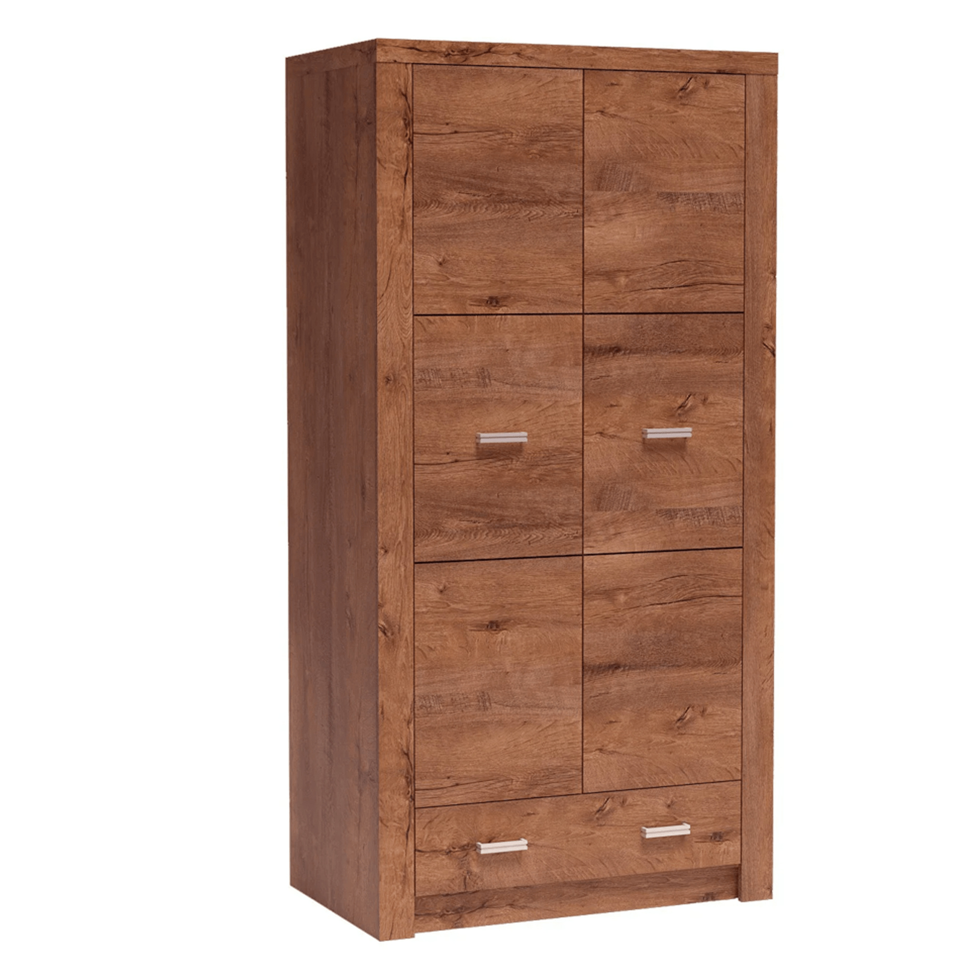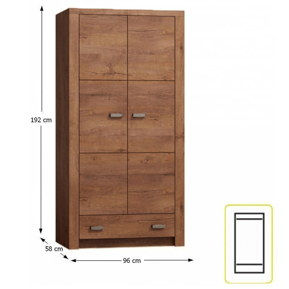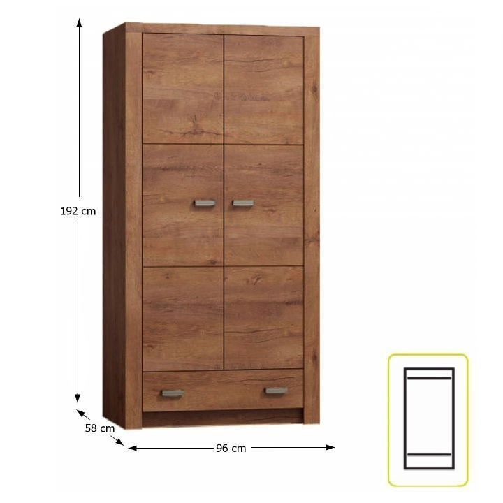 Skříň 02 z luxusního sektorového nábytku Korpus hrubý až 48 mm, Tloušťka materiálu zbývající části: 16 mm, úchytky kovové Materiál DTD laminovaná, ABS hrany, barevné provedení: jasan světlý, Rozměry ŠxHxV: 56x58x192 cm. Dodávané v demontu. Hmotnost: 58.6kg