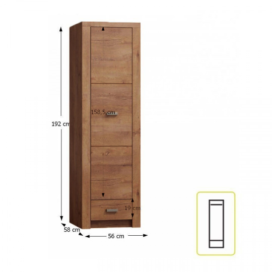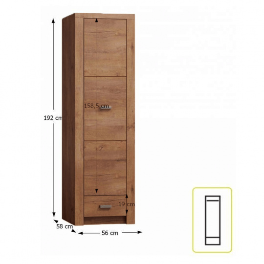 Skříň 02 z luxusního sektorového nábytku Korpus hrubý až 48 mm, Tloušťka materiálu zbývající části: 16 mm, úchytky kovové Materiál DTD laminovaná, ABS hrany, barevné provedení: jasan světlý, Rozměry ŠxHxV: 56x58x192 cm. Dodávané v demontu.