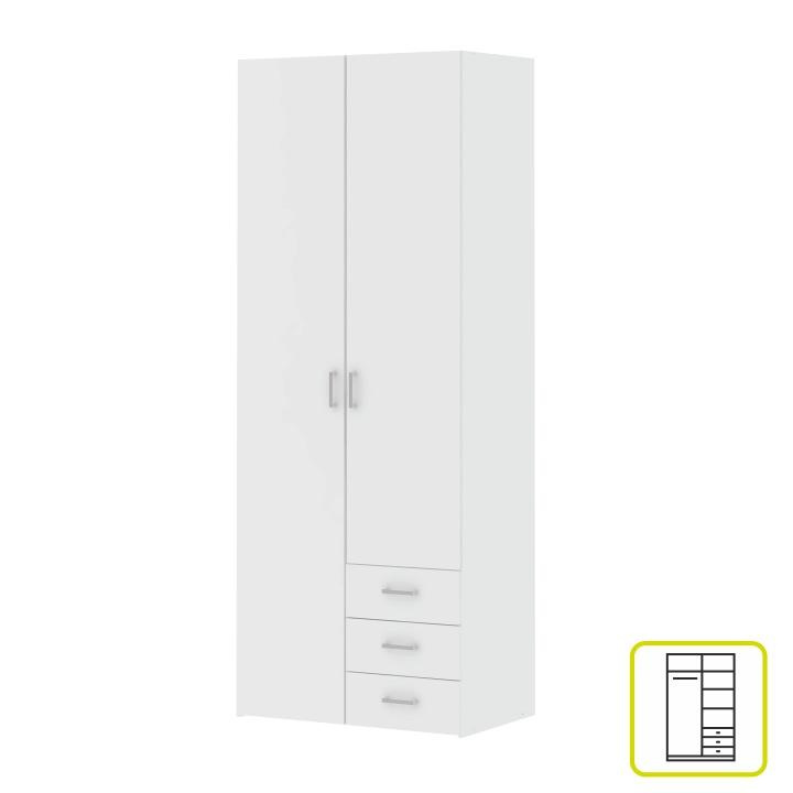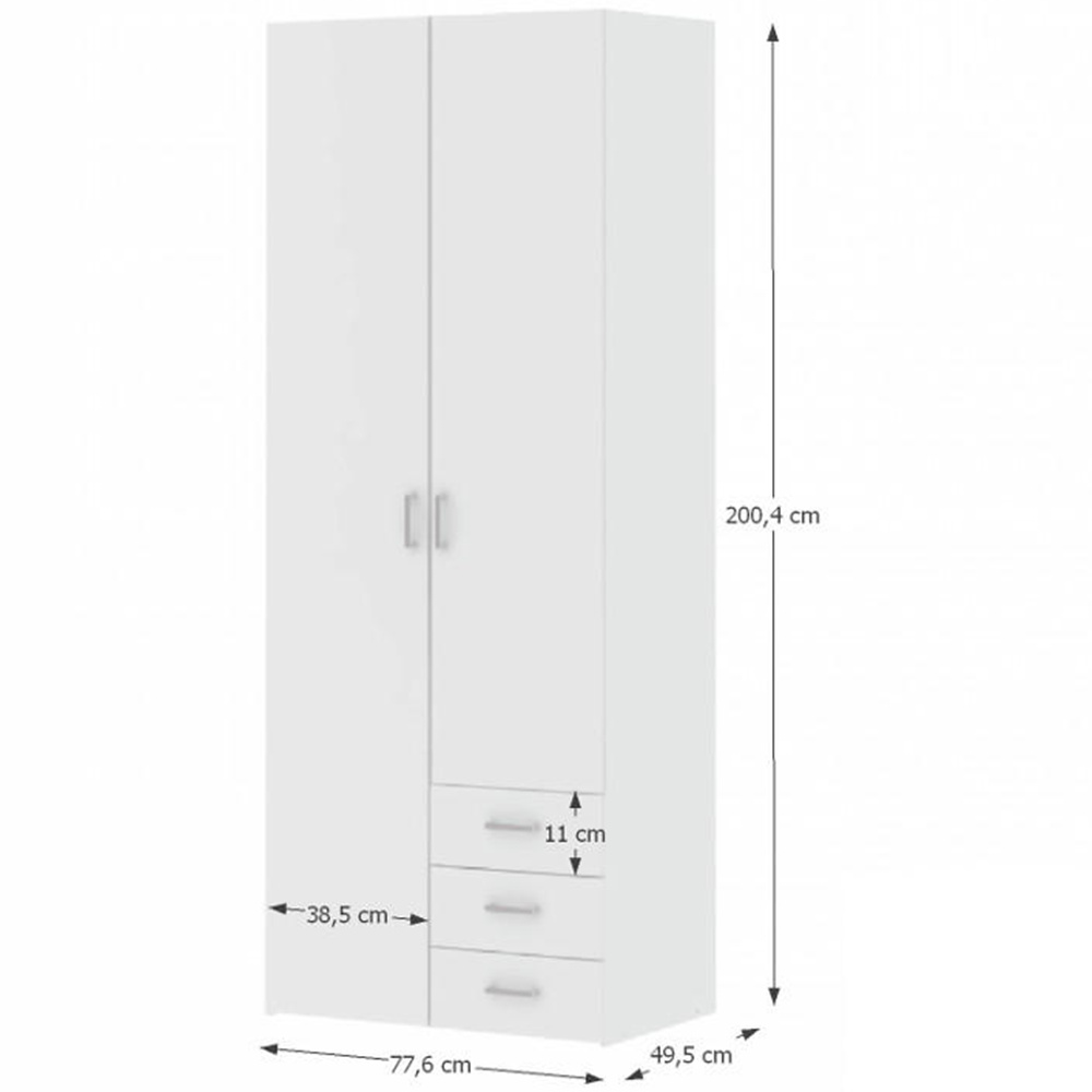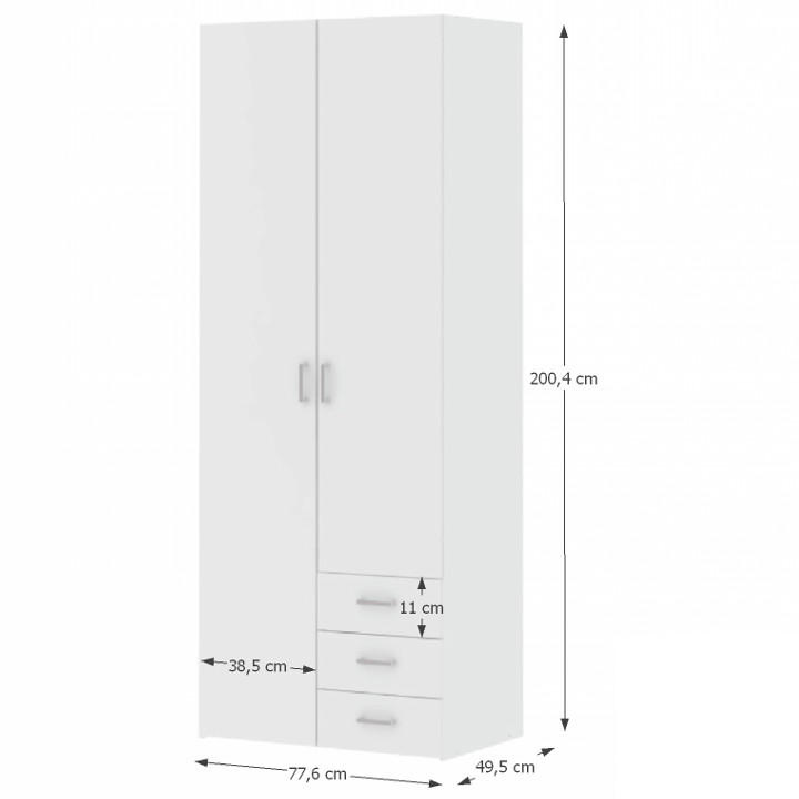 2-dveřová skříň GWEN 70425 Materiál: DTD fóliovaná Provedení: bílá Rozměry (ŠxHxV): 77,6x49,5x200,4 cm Výška od země po věšákovou tyč: 148 cm Věšáková část. Tři šuplíky Dodávané v demontu.