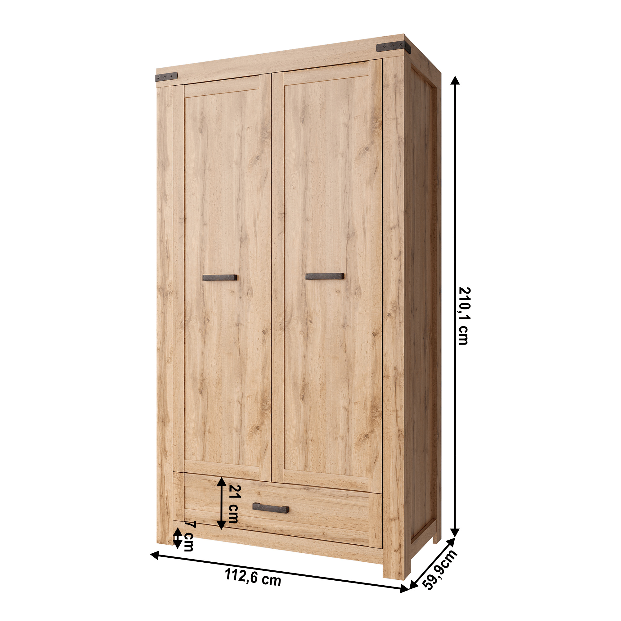 Materiál: DTD laminovaná/MDF/plast Barva: dub wotan Rozměry (ŠxHxV): 112,6x59,9x210,1 cm Výška nožiček 7 cm Tloušťka materiálu: 1,6 - 2,2 cm Kombinovaná Dvoudveřová Jedna skříňka Ve skříňce je věšáková tyč a police Jeden šuplík Výška šuplíků: 21 cm Plastový dekor a úchytky MDF dvířka Dodávána v demontu