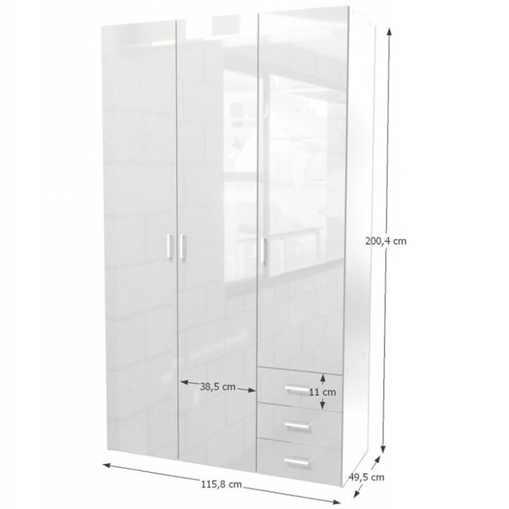 3-dveřová skříň GWEN 70427 Materiál: DTD fóliovaná Provedení: bílá extra vysoký lesk Rozměry (ŠxHxV): 115,8x49,5x200,4 cm Výška od země po věšákovou tyč: 148 cm Tloušťka materiálu: 12 mm Věšáková část Tři šuplíky Poličky Dodávané v demontu
