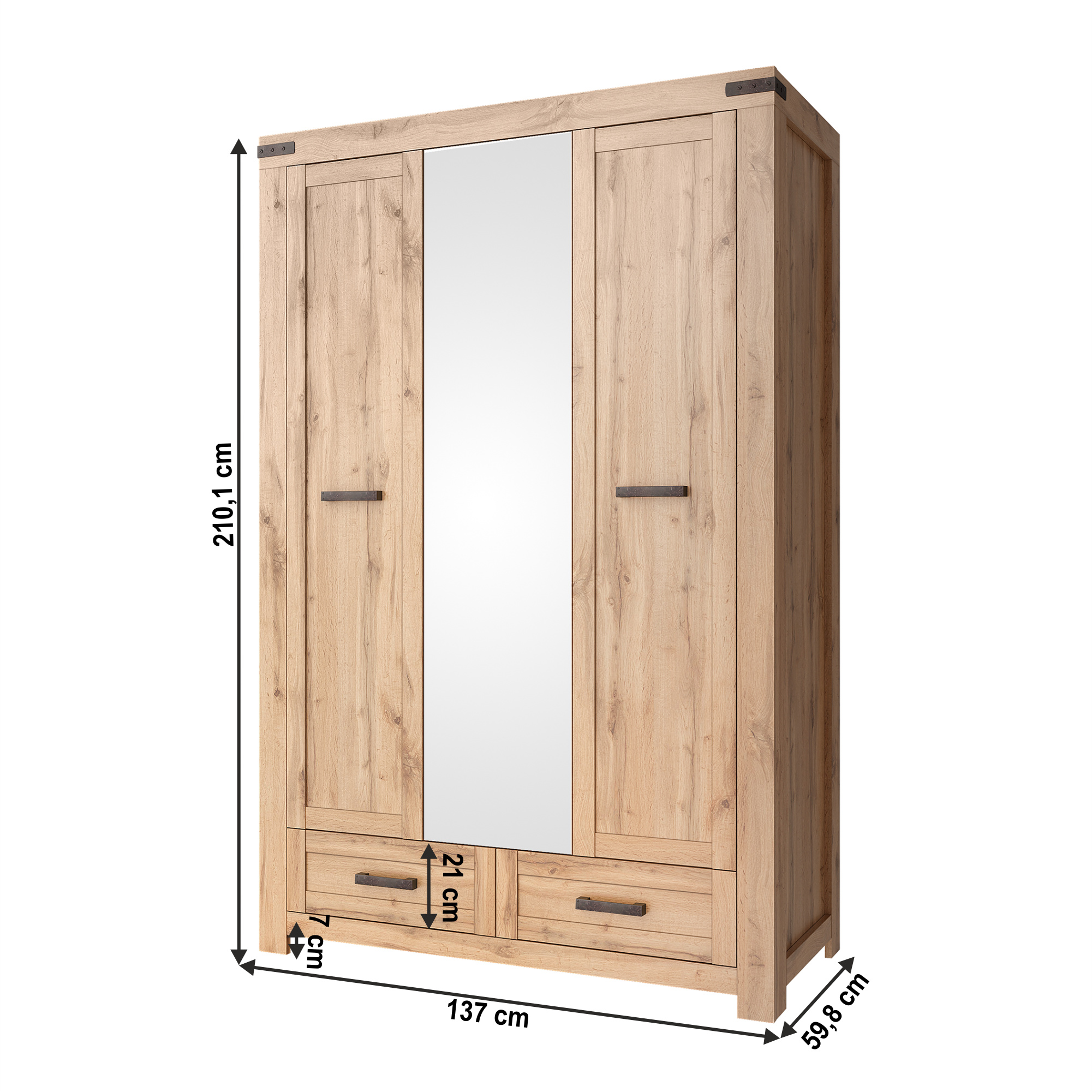 Skříň se zrcadlem Moratiz 3D2S Materiál: DTD laminovaná/MDF/plast/sklo Barva: dub wotan Rozměry (ŠxHxV): 137x59,8x210,1 cm Výška nožiček 7 cm Tloušťka materiálu: 1,6 - 2,2 cm Kombinovaná Třídveřová Dvě skříňky Ve skříňce je věšáková tyč a police Da šuplíky Výška šuplíků: 21 cm Plastový dekor a úchytky MDF dvířka Dodávána v demontu
