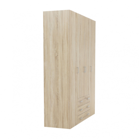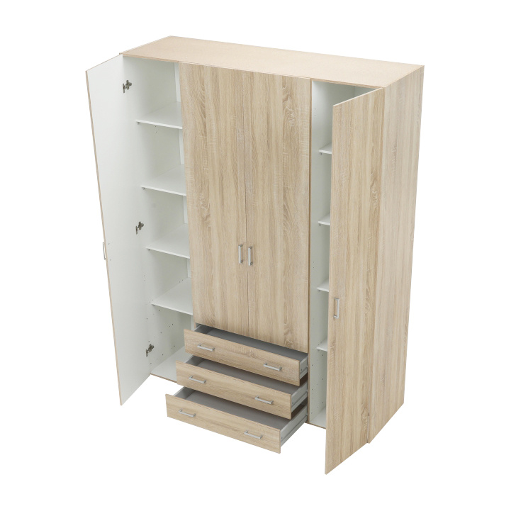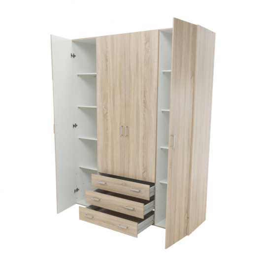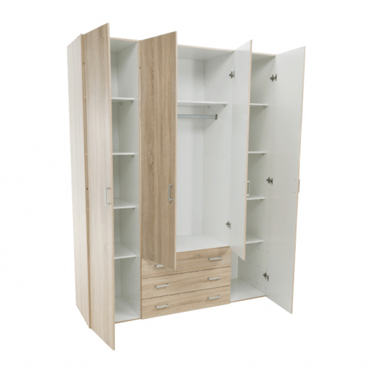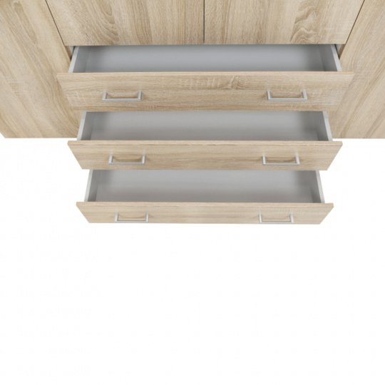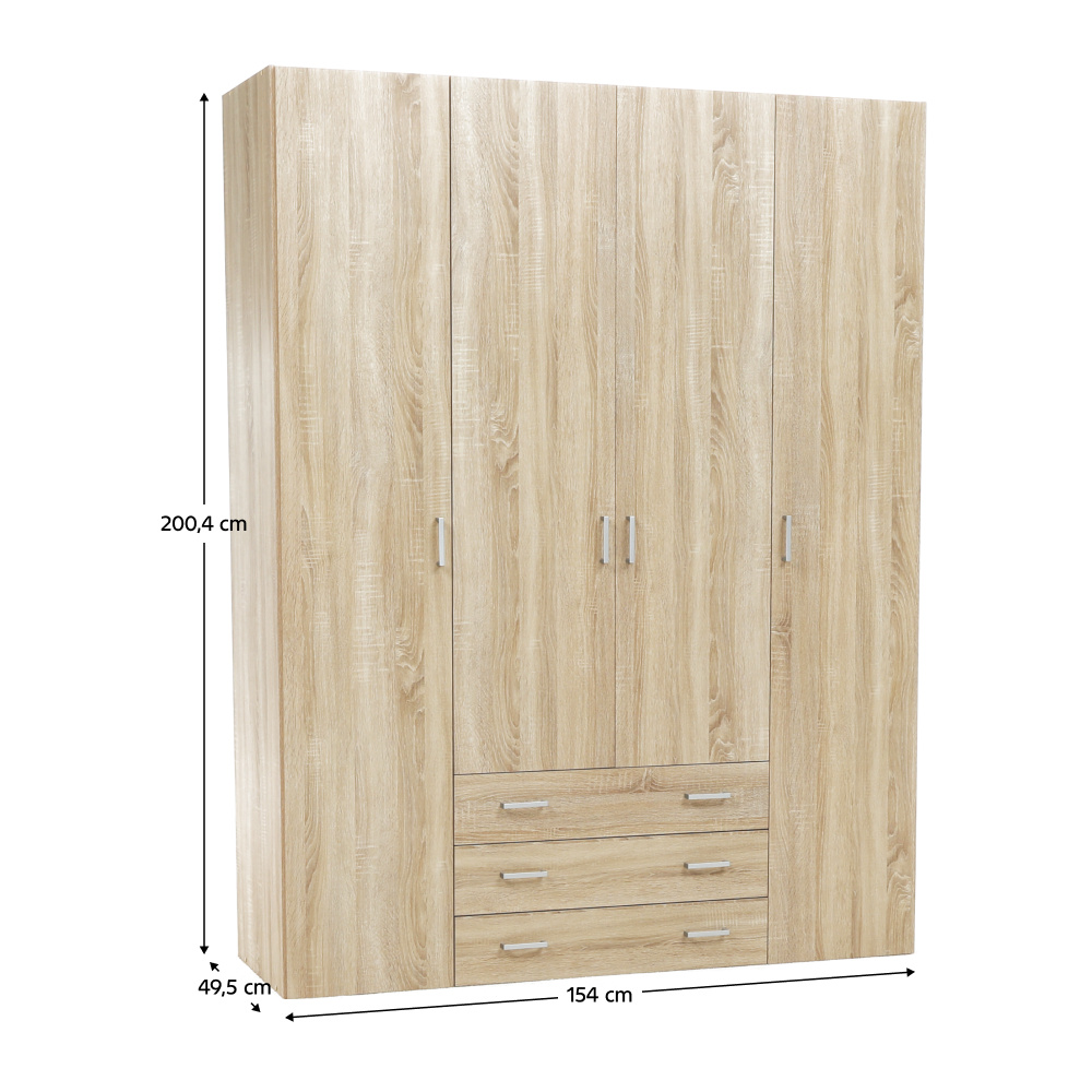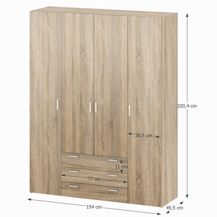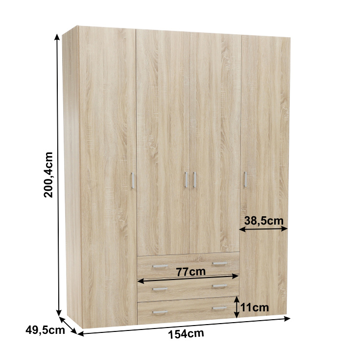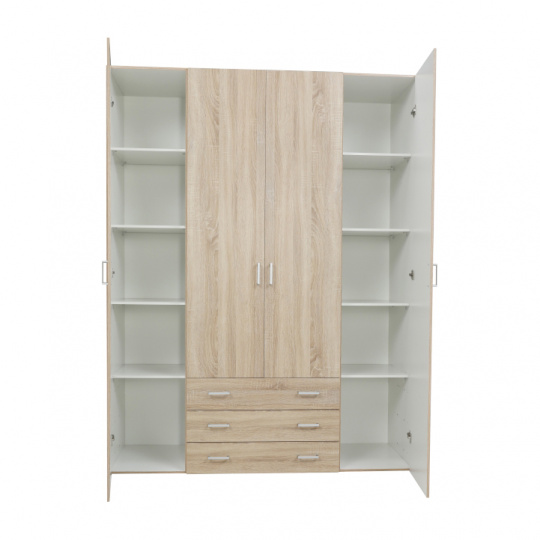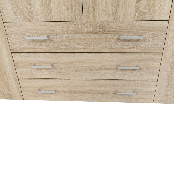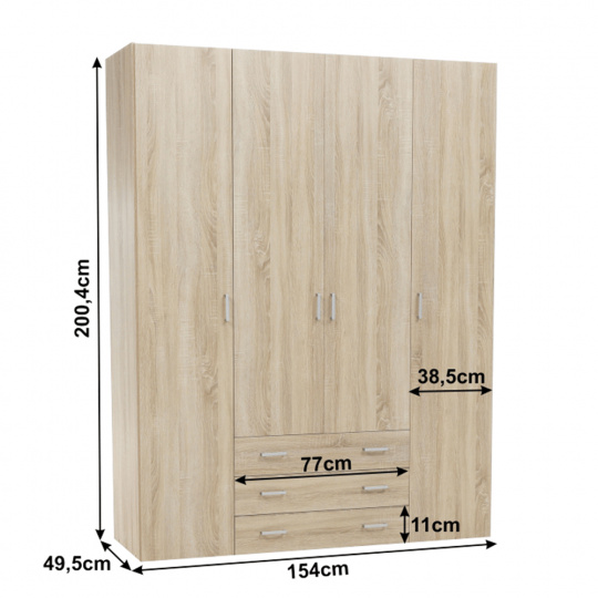 4 - dveřová skříň s věšákovou tyčí a policí, boční skříňky regálové, 3 šuplíky, GWEN 70429 Barva: dub sonoma Materiál: DTD fóliovaná Rozměry (ŠxHxV): 154,8x49,5x200,4 cm Výška od země po věšákovou tyč: 148 cm Tloušťka materiálu: 12 mm Dodávané v demontu.