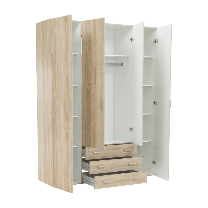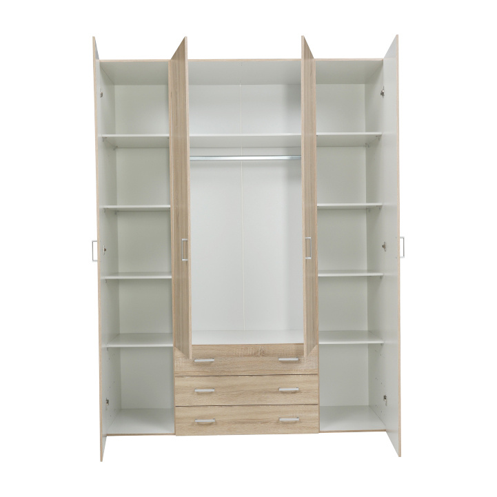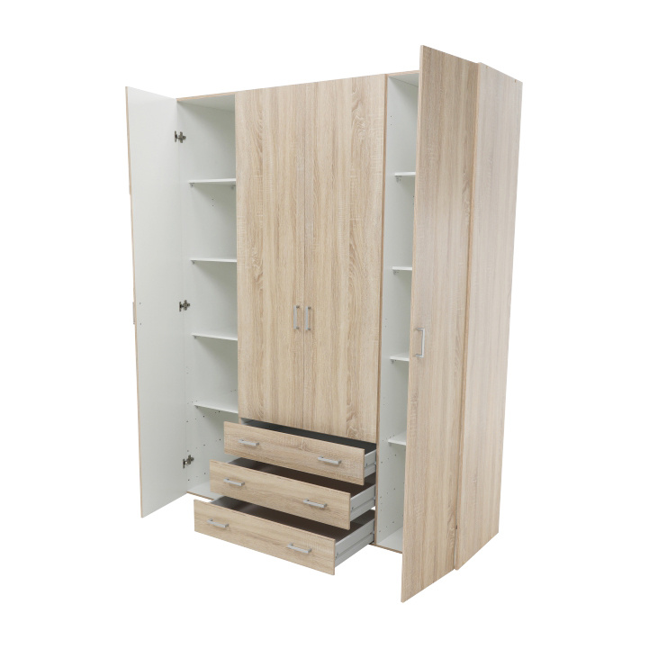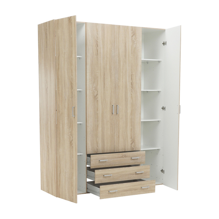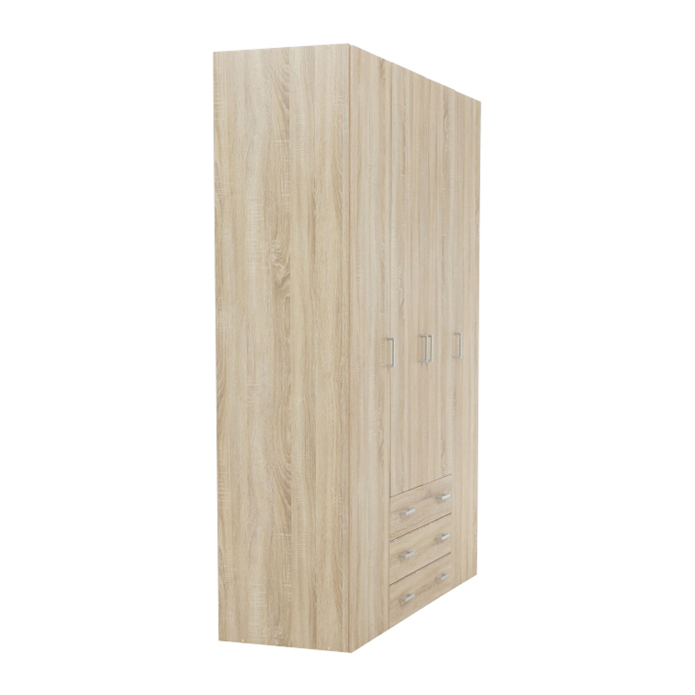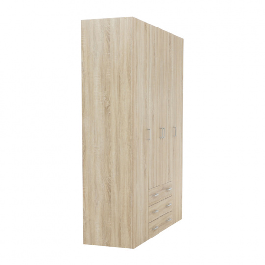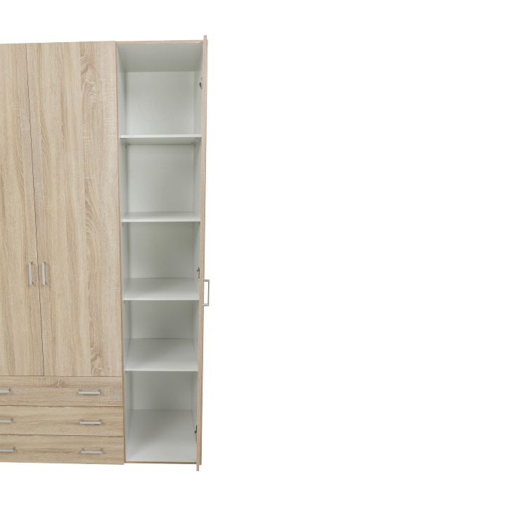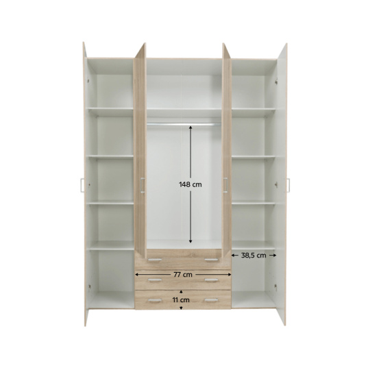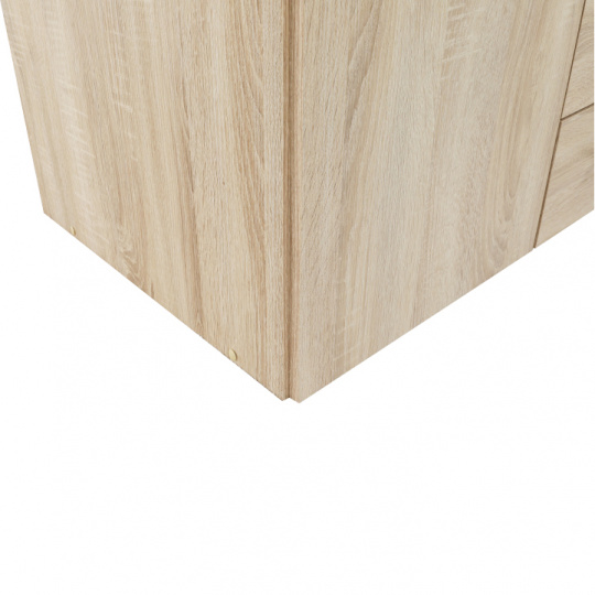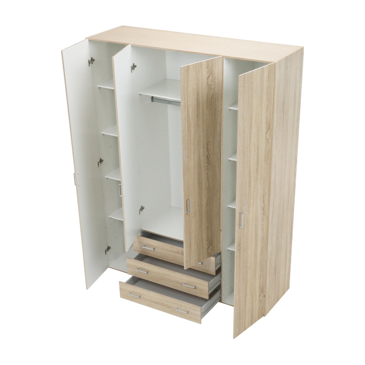4 - dveřová skříň s věšákovou tyčí a policí, boční skříňky regálové, 3 šuplíky, GWEN 70429 Barva: dub sonoma Materiál: DTD fóliovaná Rozměry (ŠxHxV): 154,8x49,5x200,4 cm Výška od země po věšákovou tyč: 148 cm Tloušťka materiálu: 12 mm Dodávané v demontu.
