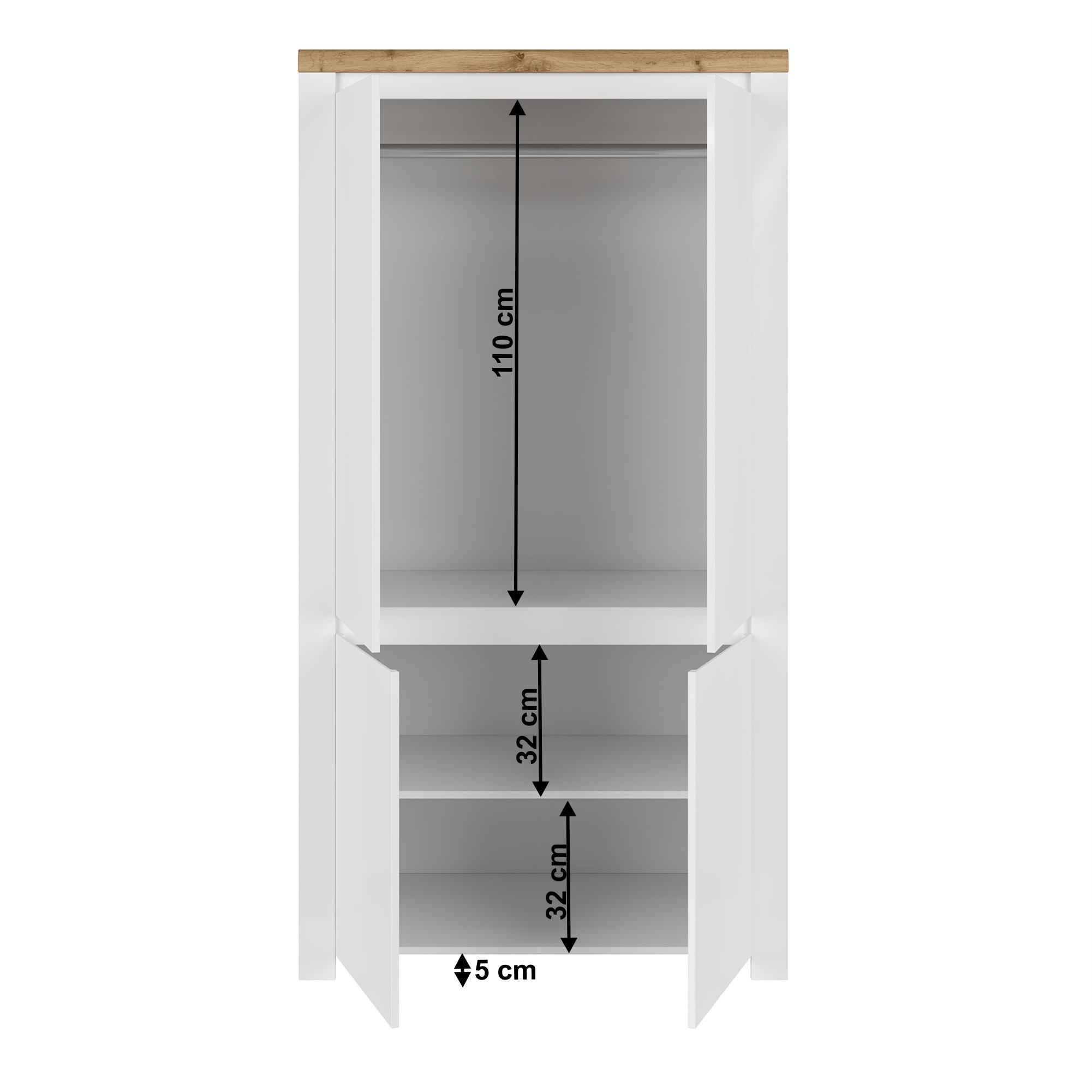 Materiál: DTD laminovaná/ABS hrany/MDF Barva: bílý extra vysoký lesk/dub wotan Rozměry (ŠxHxV): 106x56x202 cm Tloušťka materiálu: 1,6 - 2,2 cm Výška spodního prostoru od podlahy: 5 cm 4 dveřní 3 police, 1 věšáková tyč Ve skříňkách jsou police Výška horní police: 110 cm Výška spodních polic: 32 cm Spousta úložného prostoru Bez úchytek MDF dvířka Otevírání/zavírání pomocí výřezu Dodávána v demontu
