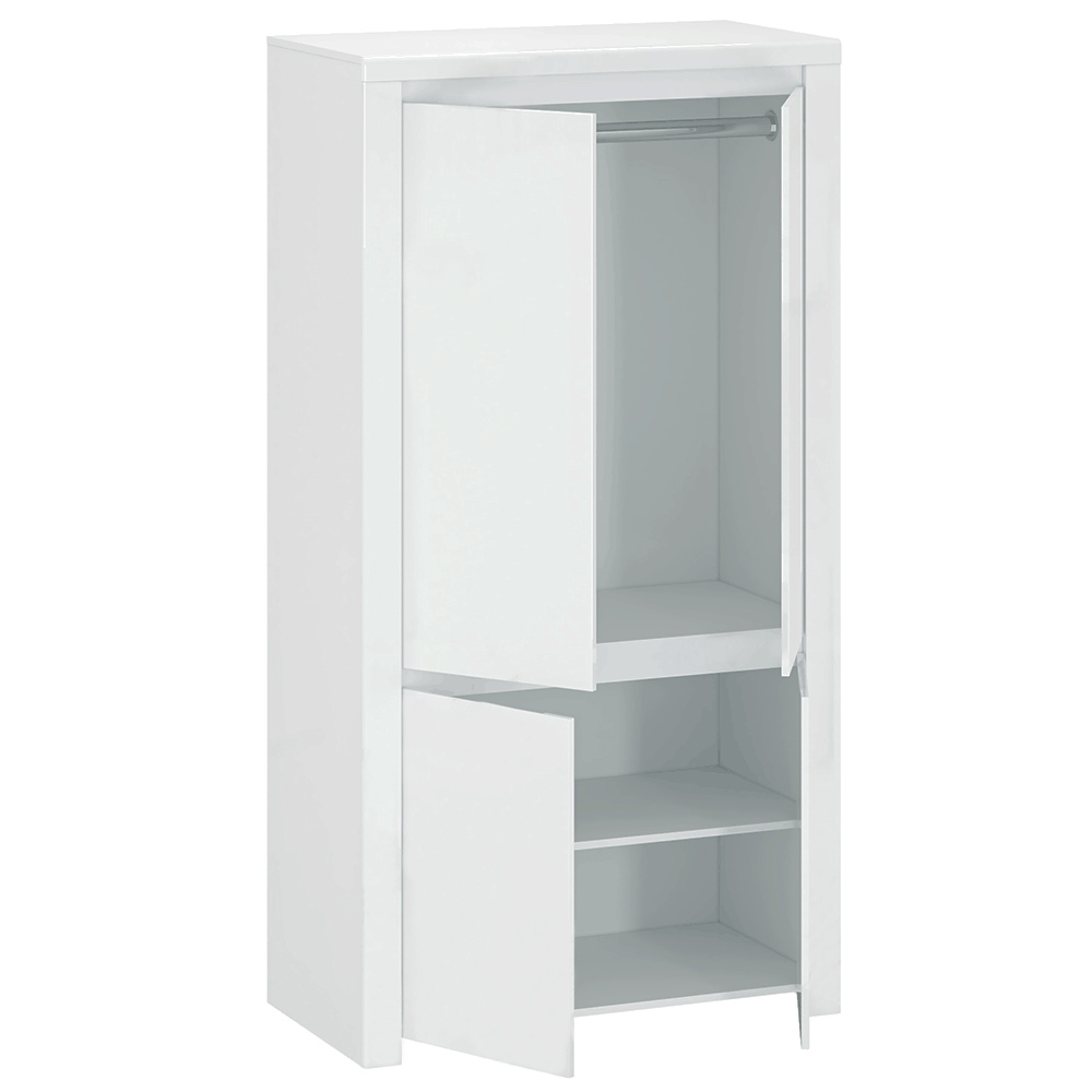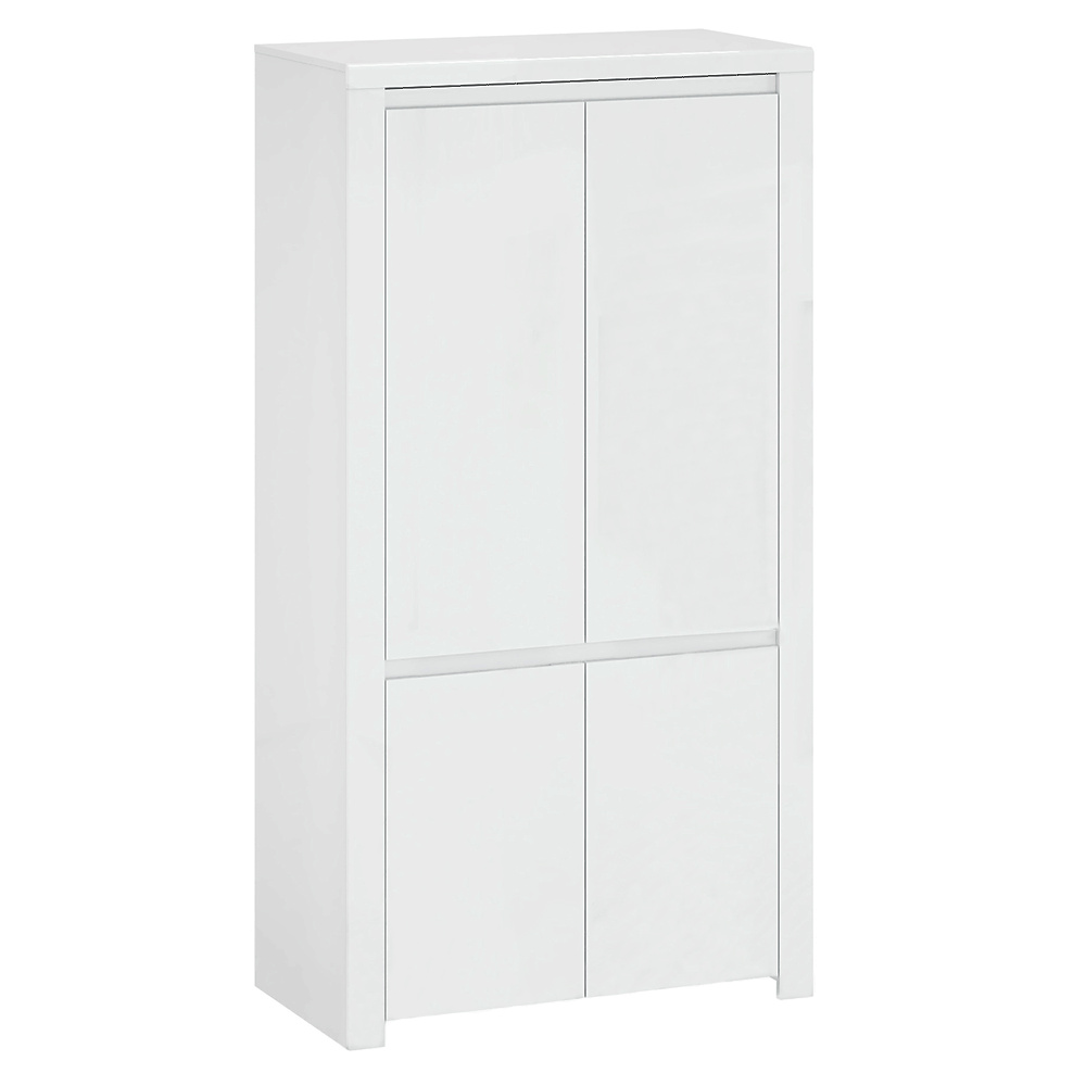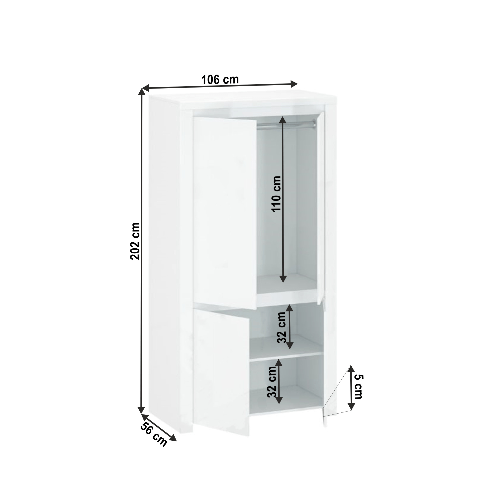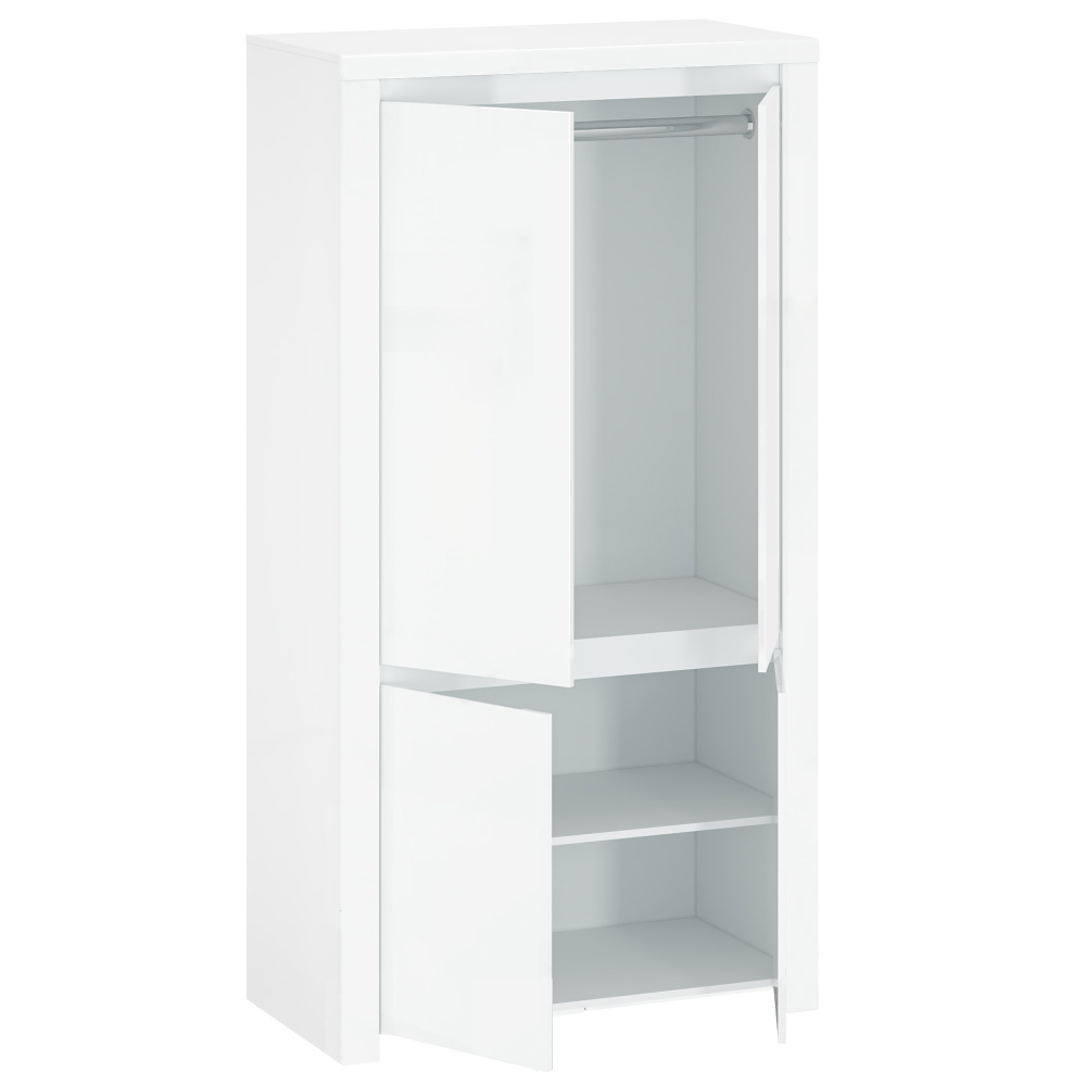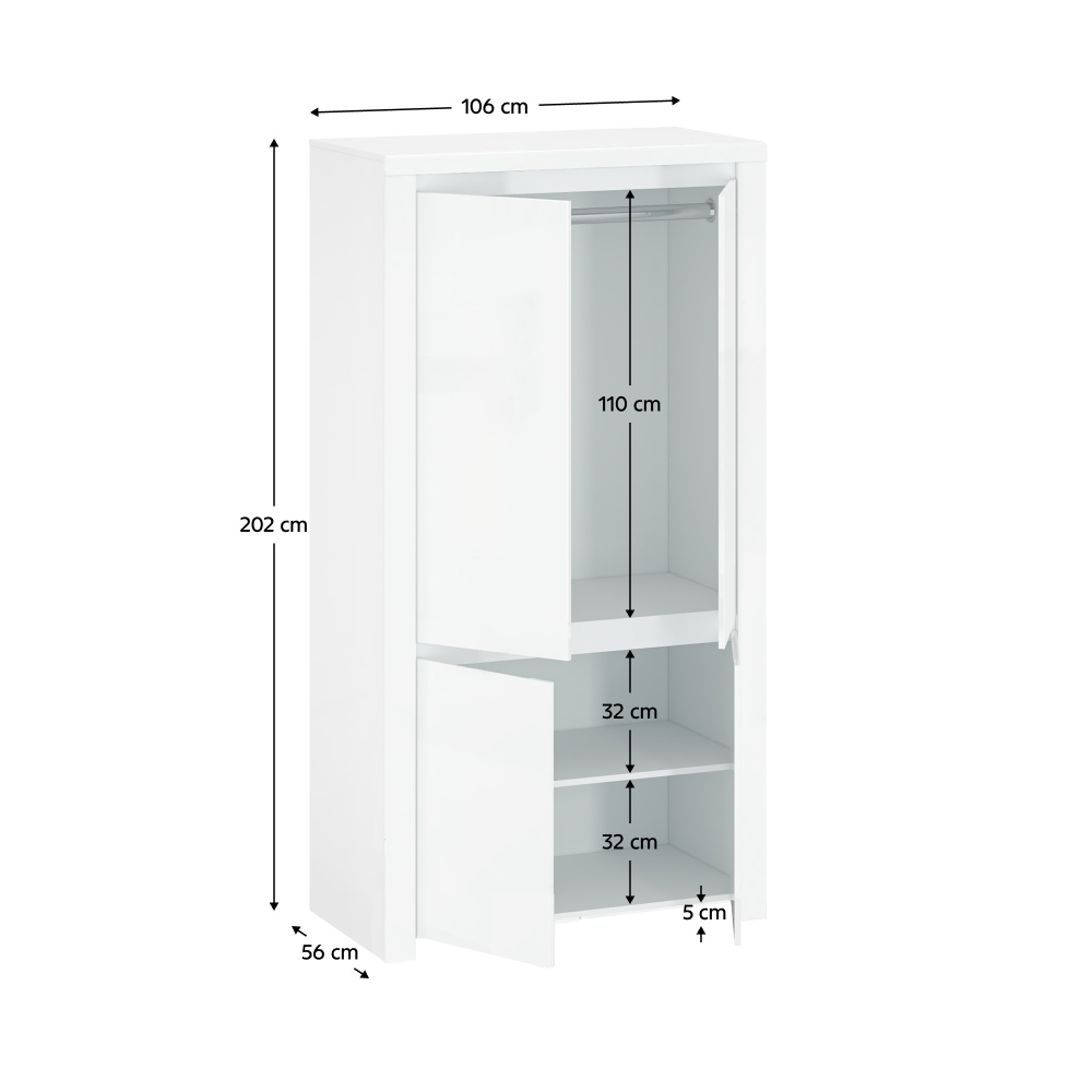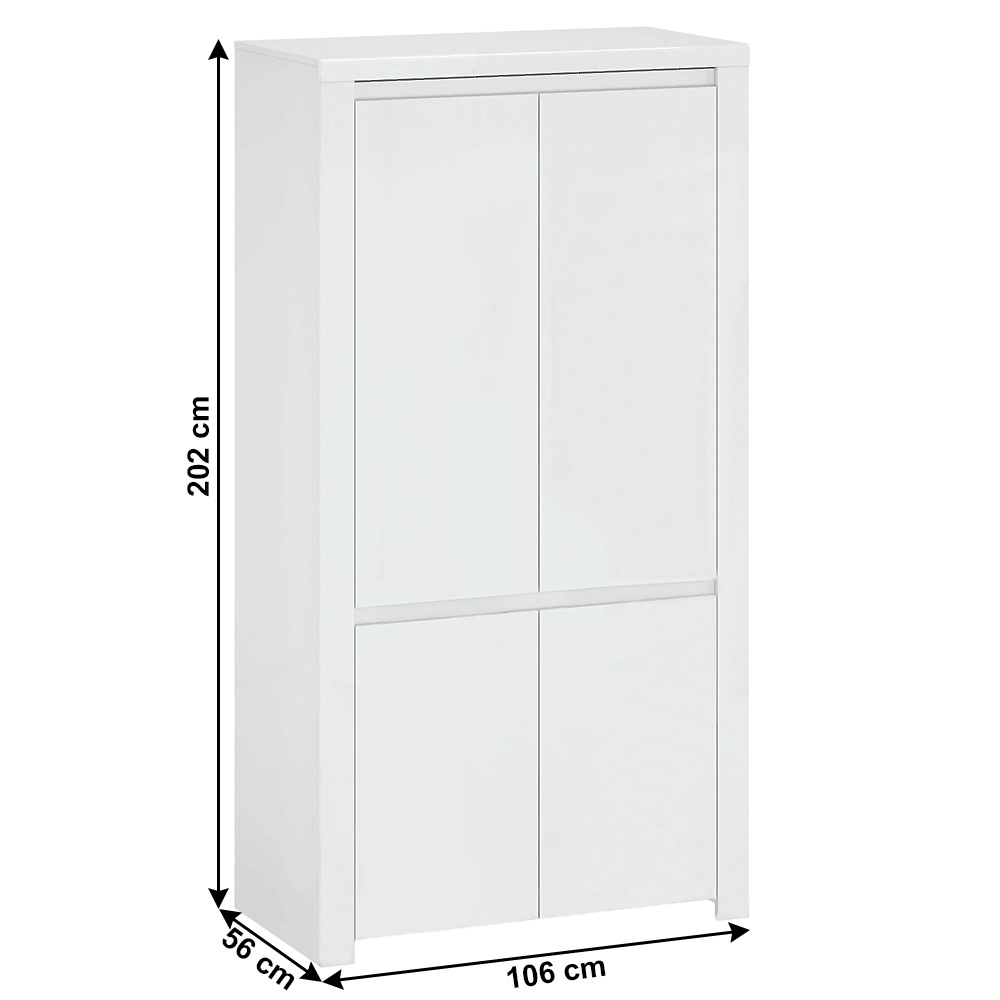 Materiál: laminovaná DTD / MDF Barva: bílý lesk Rozměry (ŠxHxV): 106x56x202 cm Materiál dvířka: MDF Tloušťka materiálu: 1,6 cm ABS hrany 4 dveřová 3 police, 1 věšáková tyč Dostatek úložného prostoru bez úchytek Moderní design a elegantní vzhled Dodávané v demontu