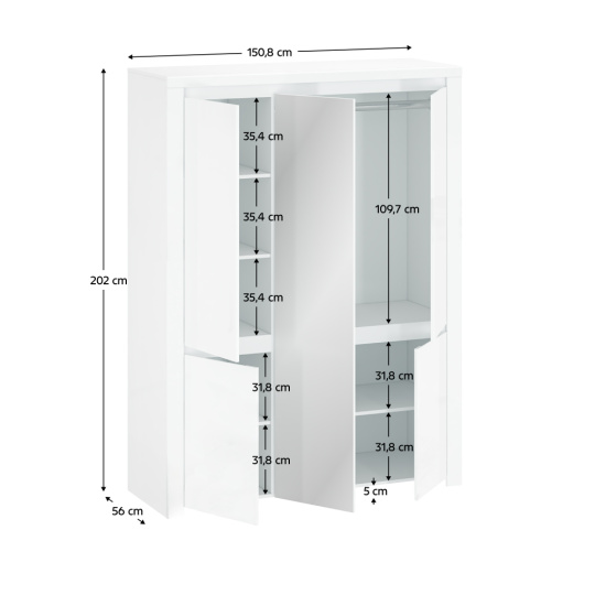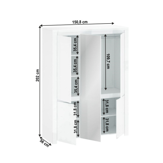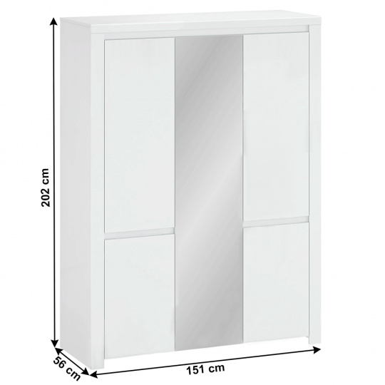 Materiál: laminovaná DTD / MDF Barva: bílý lesk Rozměry (ŠxHxV): 150,8x56x202 cm Materiál dvířka: MDF Tloušťka materiálu: 1,6 cm ABS hrany 5 dveřová 4 police, 1 věšáková tyč, 1 zrcadlo Spousta úložného prostoru bez úchytek Moderní design a elegantní vzhled Dodávané v demontu