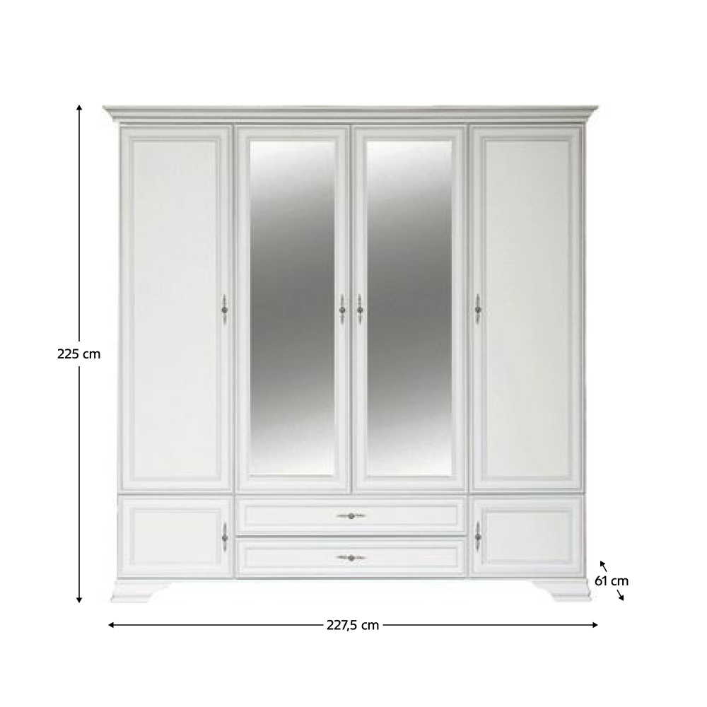 Materiál: DTD laminovaná Barva: alpská bílá Rozměry (ŠxHxV): 227,5x61x225 cm Tloušťka materiálu: 1,6 cm Se zrcadlem Šestidveřová Na nožičkách Výška nožiček: 8 cm Kovové úchytky Barva úchytek: antické stříbro Úložný prostor 2 šuplíky Nosnost šuplíku: 3 kg Věšáková tyč Policová část Nosnost police: 4 kg Doporučujeme připevnit ke zdi Dodáváno v demontu