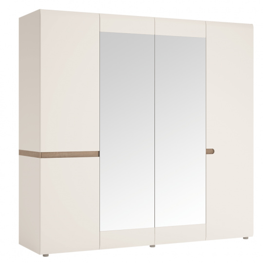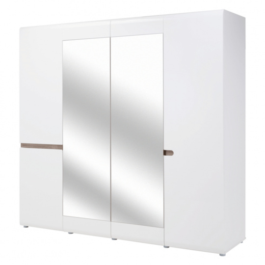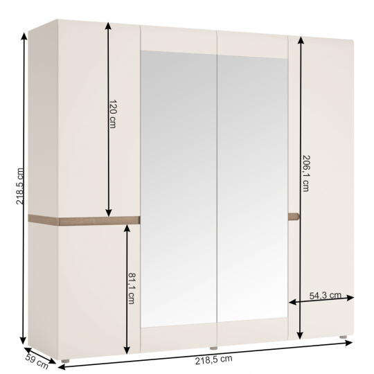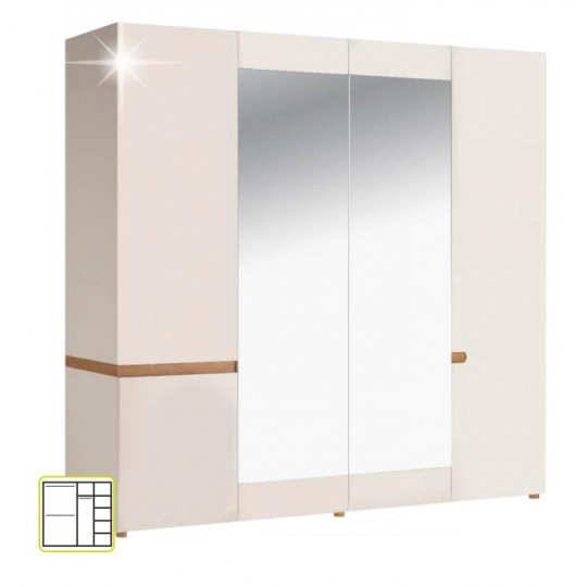 Čtyřdveřová skříň LYNATET 23 Materiál: laminovaná DTD/fóliovaná MDF/sklo Barva: dub sonoma truflový/bílá s extra vysokým leskem Rozměry (ŠxHxV): 218,5x59x209 cm Tloušťka materiálu: 16 mm Nosnost police: 5 kg Nosnost spodní police: 20 kg Moderní zaoblené hrany Čtyřdveřová Korpus je v matném provedení Dvířka jsou v provedení extra vysoký lesk Policová část Věšáková část Se zrcadlem Dodáváno v demontu