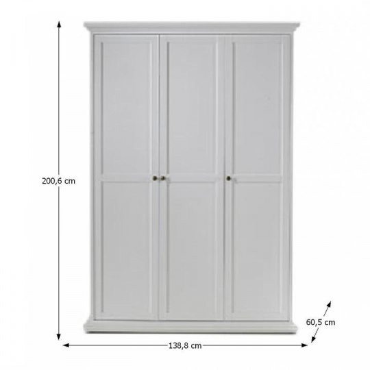 Třídveřová skříň PARIS 3D 75353 v provensálském stylu. Materiál: DTD laminovaná/lakovaná MDF Barevné provedení: bílá Rozměry (ŠxHxV): 138,8x60,5x200,6 cm Tloušťka materiálu: 18 mm Dodáváno v demontu