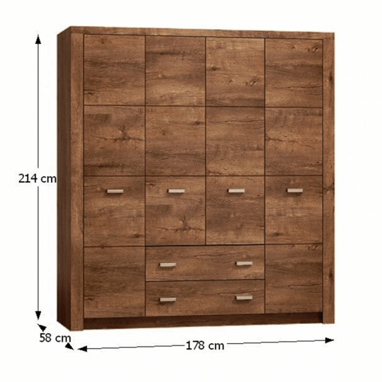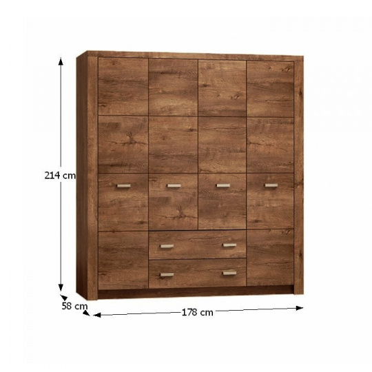 Skříň INFINITY 1-18 Materiál / provedení: DTD laminovaná / ABS hrany, jasan tmavý Rozměry (ŠxHxV): 178x58x214 cm Tloušťka materiálu: 48 mm Tloušťka materiálu zbývající části: 16 mm Možnost dokoupení ostatních částí sestavy Dodávané v demontu Hmotnost: 170kg