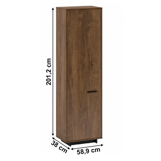Materiál: DTD laminovaná / MDF fóliovaná Barva: dub bolzano / černá Rozměry (ŠxHxV): 58,9x38x201,2 cm Tloušťka materiálu: 16 mm jednodveřová skříňka pět polic levé provedení na podstavci Výška spodního prostoru od podlahy: 5 cm kovová úchytka originální design Krásná kresba dřeva Do tradičního i moderního interiéru Do obývacího pokoje, pracovny i studentského pokoje Dodávána v demontu