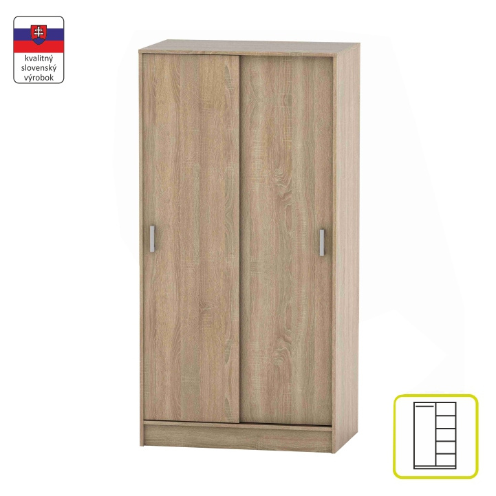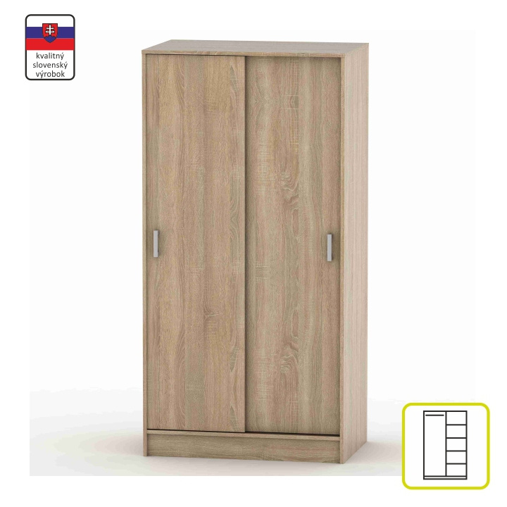 Skříň BETTY 4 dvoudveřová s posuvnými dveřmi. Materiál: DTD laminovaná Barva: dub sonoma Rozměry (ŠxHxV): 90,2x58,2x180 cm. Hloubka lamina: 1,6 cm Slovenský výrobek. Dodávané v demontu. Hmotnost: 64kg