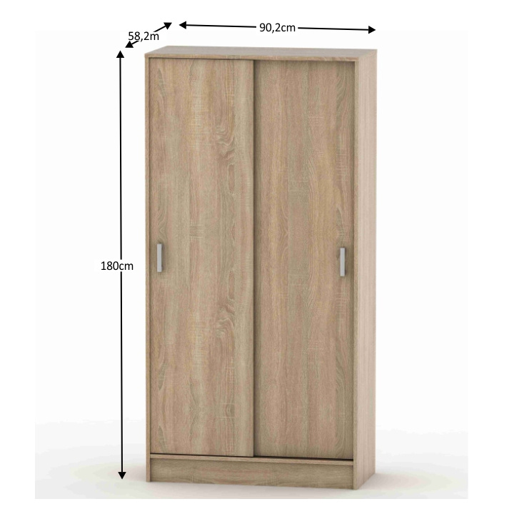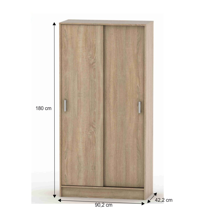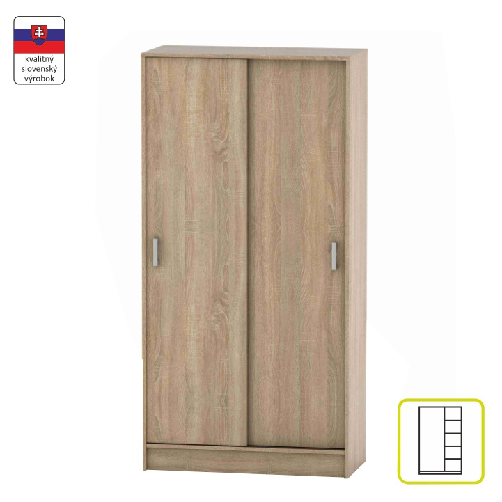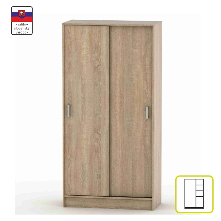 Skříň BETTY 4 dvoudveřová s posuvnými dveřmi. Materiál: DTD laminovaná Barva: dub sonoma Rozměry (ŠxHxV): 90,2x58,2x180 cm. Hloubka lamina: 1,6 cm Slovenský výrobek. Dodávané v demontu. Hmotnost: 64kg