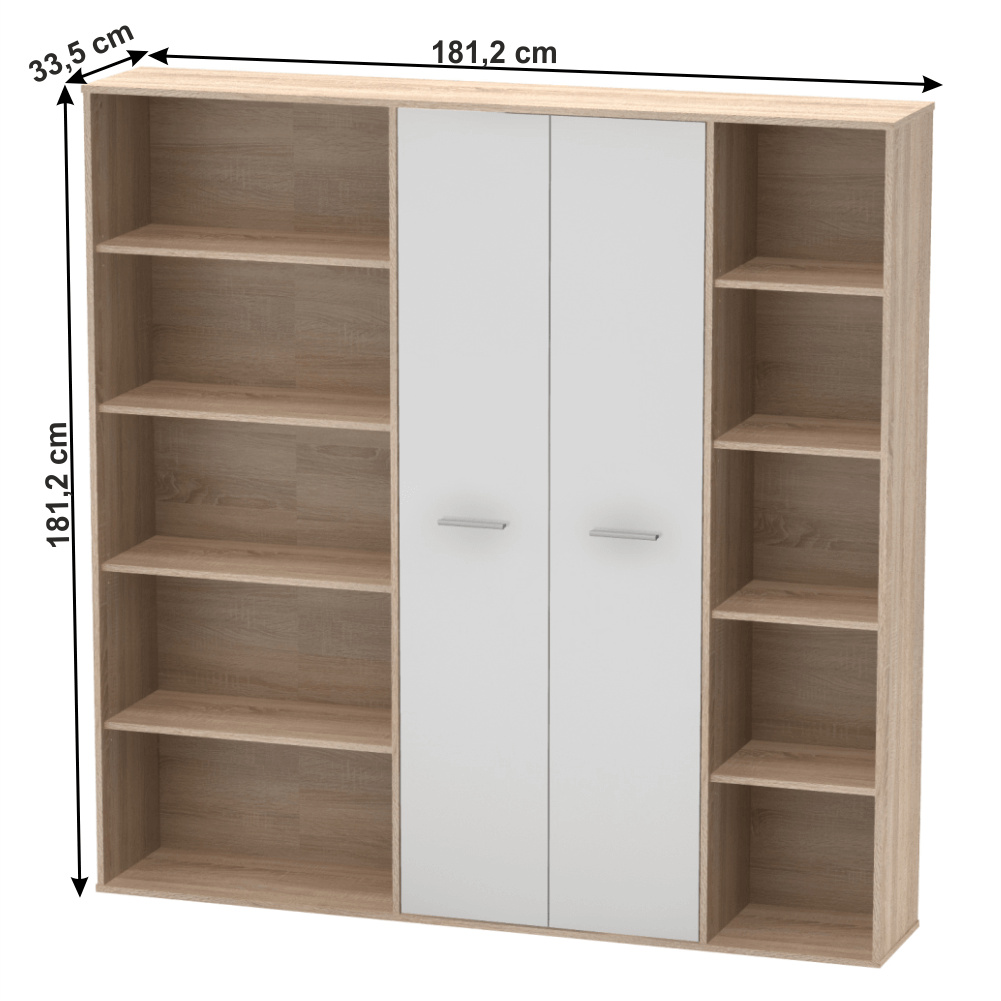 Skříň Maurus NEW MA50 Materiál: laminovaná DTD Barevné provedení: dub sonoma / bílá Rozměry (ŠxHxV): 181,2x33,5x181,2 cm Tloušťka materiálu: 16 mm Dodávané v demontu.
