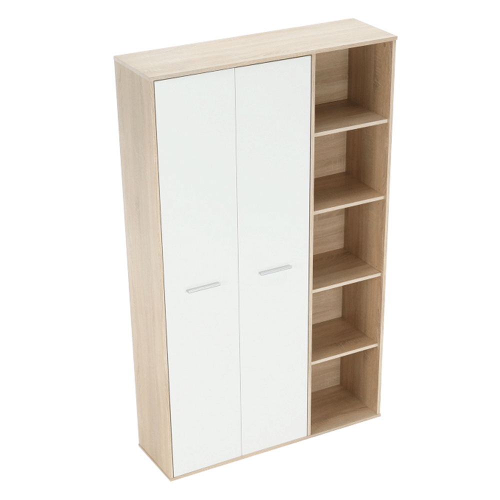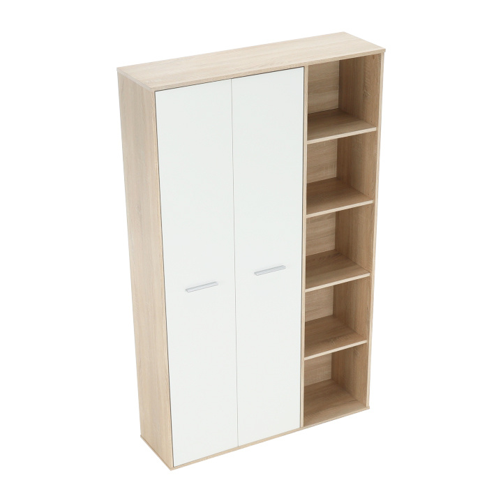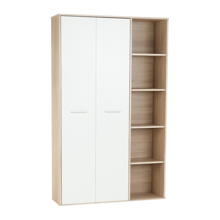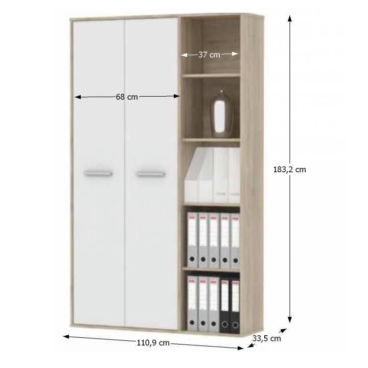 Kancelářská skříň JOHAN 2 NEW 05 s dvířky barevné provedení: dub sonoma / bílá materiál: DTD lamiovaná / ABS hrany Rozměry (ŠxHxV): 72,5x33,8x186 cm Tloušťka materiálu: 16/22 mm Policová slovenský výrobek Dodávané v demontu Hmotnost: 46.5kg