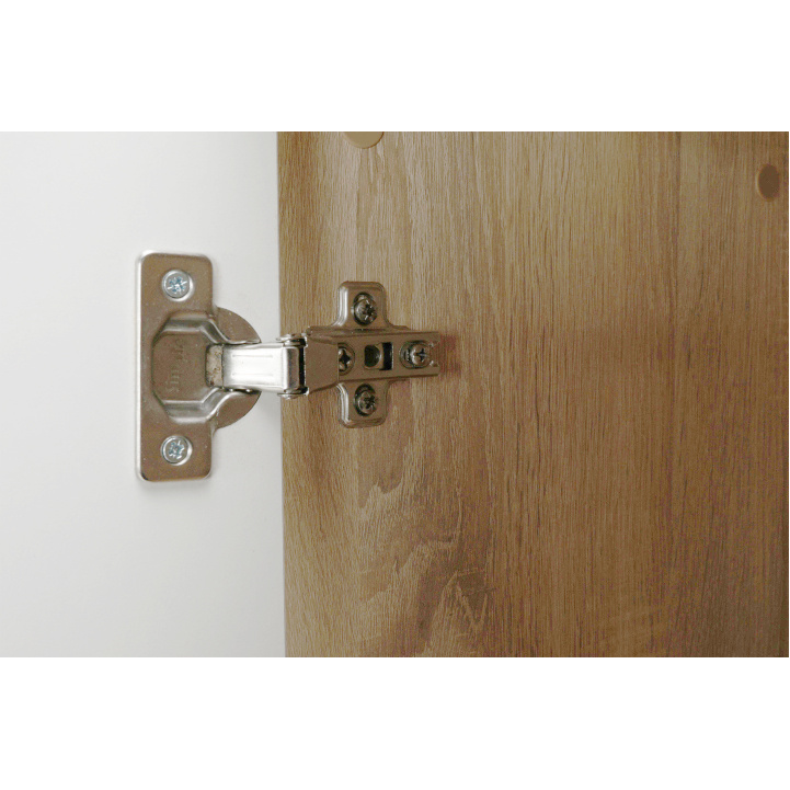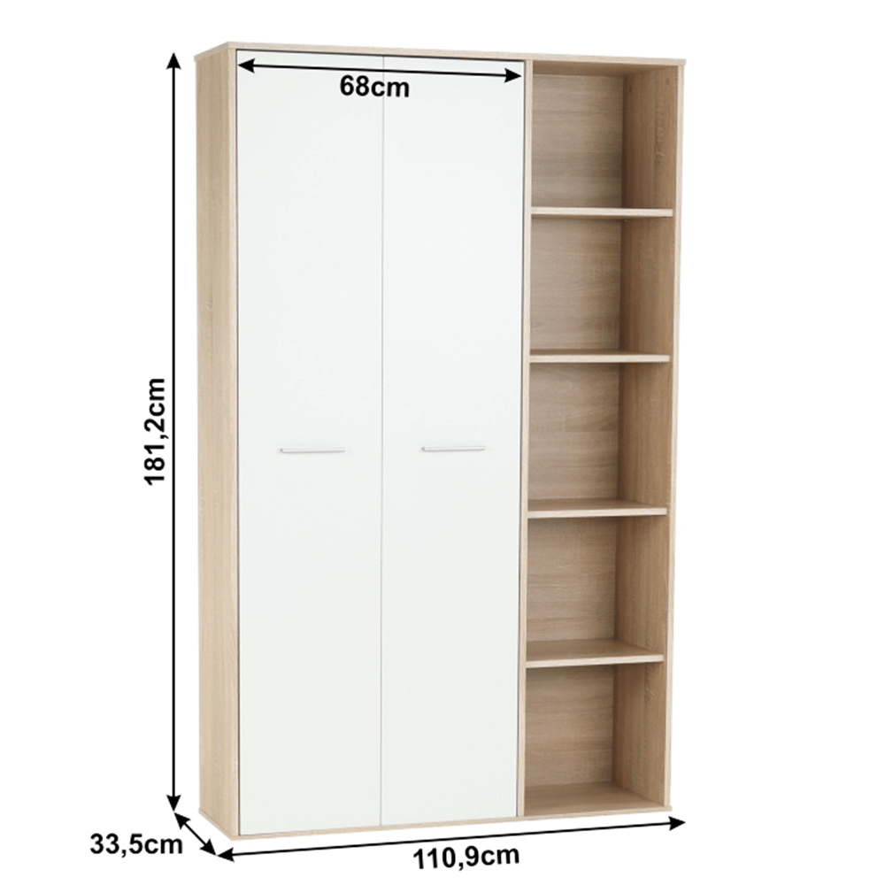 Skříň Maurus NEW MA52 Materiál: laminovaná DTD Barevné provedení: dub sonoma / bílá Rozměry (ŠxHxV): 110,9x33,5x181,2 cm Tloušťka materiálu: 16 mm Šířka poliček za dvířky: 68,7 cm Šířka policové části: 36,8 cm Šířka dvířek: 33,9 cm Dodávané v demontu.