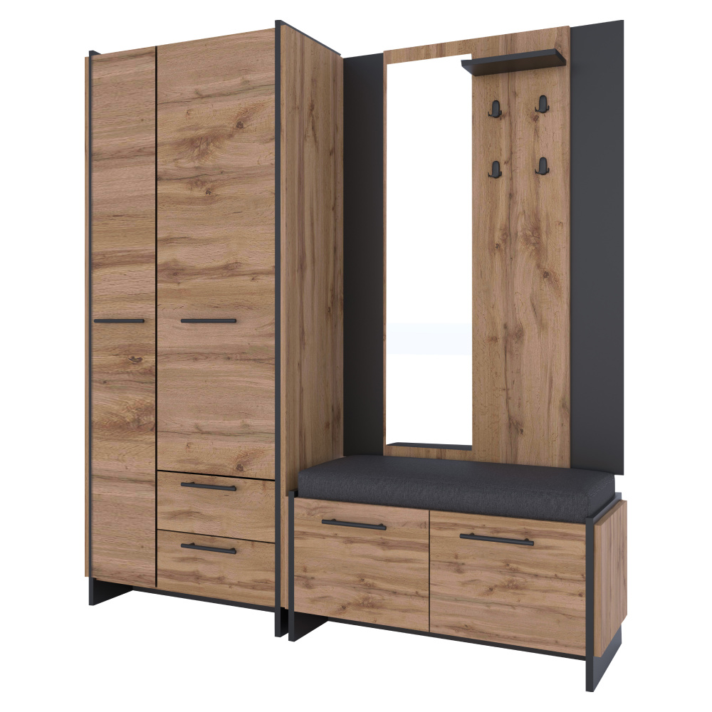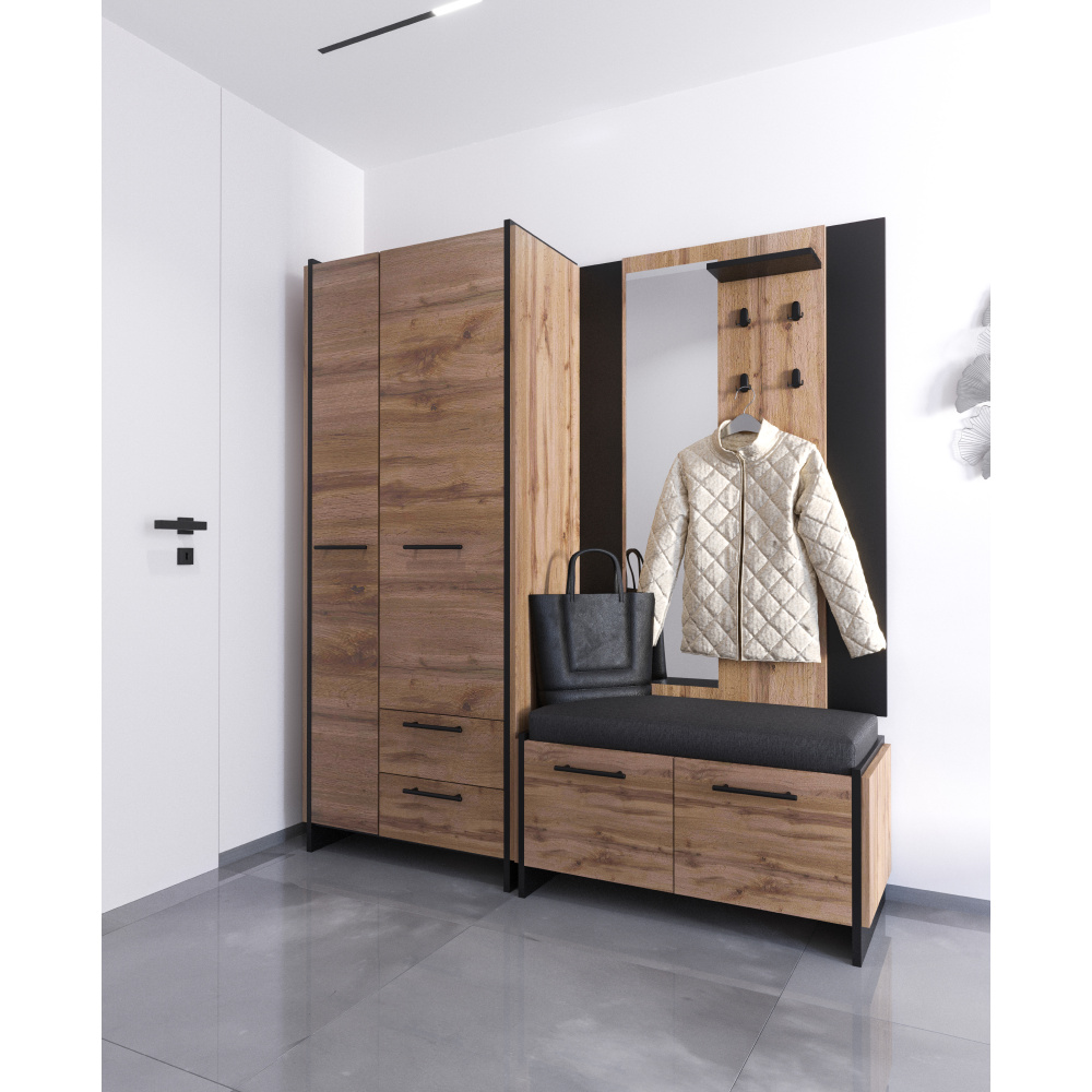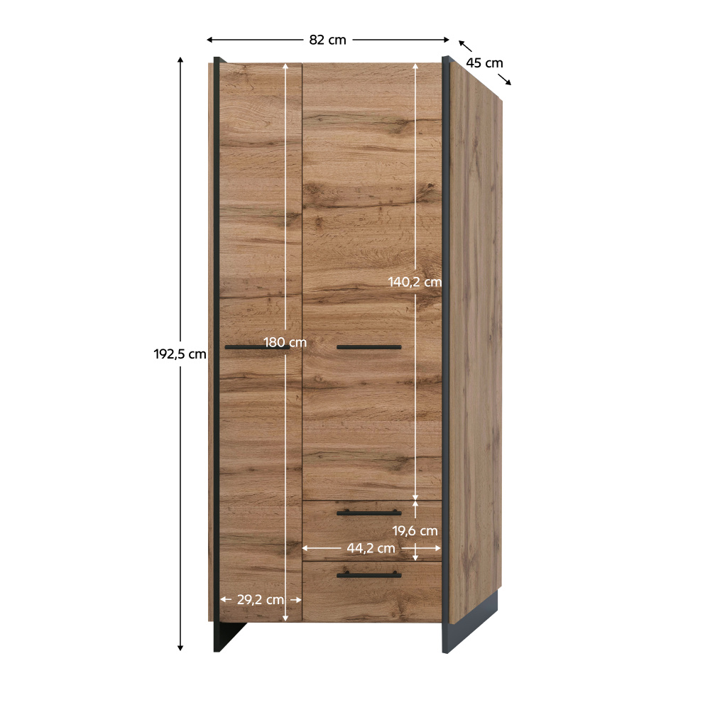 Materiál: DTD laminovaná/ABS hrany Barva: dub wotan/černá Rozměry (ŠxHxV): 82x45x192,5 cm Tloušťka materiálu: 1,6 cm Kovové úchytky Barva úchytek: černá Dvoudveřová Policová část Nosnost police: 5 kg Výsuvný věšák Nosnost výsuvného ramínka: 3 kg Šuplík Nosnost šuplíku: 5 kg Výška šuplíku: 19,6 cm Dvojitá laminovaná DTD Plastové nožičky Moderní design Doporučujeme připevnit ke stěně Dodáváno v demontu