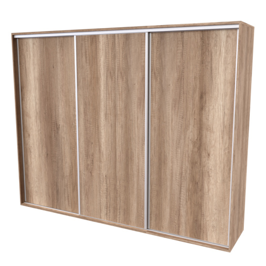 Řada skříní FLEXI 3 se vyznačuje svojí nadstandartní velikostí a úsporou místa díky posuvným dveřím. Snadné otvírání pomocí alu profilu s tlumícím kartáčem zaručuje tichý přístup nejen z levé a pravé strany (získáváte přístup i z prostřed skříně). Není tak potřeba úchytek. Skříně FLEXI nabízí možnost doplnění o zrcadlo, jenž opticky rozšíří Vaši ložnici, či o moderní kombinaci skla nebo druhého dekoru. Získáváte nespočet možností, jak skříň FLEXI zkombinovat, aby odpovídala co nejvíce Vašim představám. Vyrobeno z lamina o sílem 18/25 mm. Výběr z několika akčních dekorů. Kvalitní kování a spojovací materiál je bez použití plastových součástek, vyjma ochranných krytek. Výškově nastavitelné nohy pro dokonalé vyrovnání nepoškozují podlahu. Dvě varianty vnitřního uspořádání. Skříň je z výroby připravena na obě varianty, rozložení si volíte až při montáži. Hloubka skříní je 65 cm, možnost dveří s tlumením a dotahem. Praktické a efektní ABS hrany.