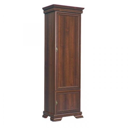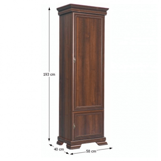 Skříň KRD1 KORA. Barevné provedení samoa king. Materiál laminovaná DTD, MDF, kov. Rozměry (ŠxHxV): 58x40x193 cm Tloušťka materiálu korpus: 15 mm Tloušťka materiálu vrchní desky: 22 mm Tloušťka materiálu dolní desky: 22 mm Výška spodního prostoru od podlahy: 10,5 cm