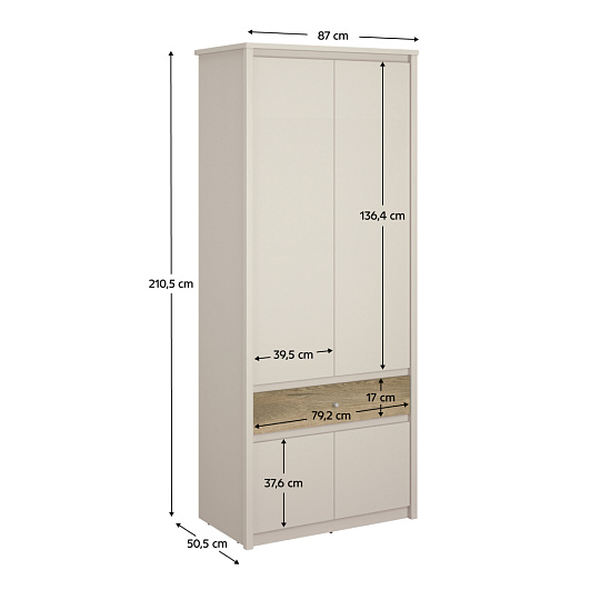 Materiál: laminovaná DTD Barva: kašmír/dub evoke Rozměry (ŠxHxV): 87x50,5x210,5 cm Tloušťka materiálu DTD: 1,6-3,2 cm Čtyřdveřová věšáková tyč Nosnost věšákové tyče: 5 kg Zásuvka S úchytkou Materiál úchytky: plast Barva úchytky: kašmír Nosnost zásuvky: 3 kg Skříňka Bez úchytky Šikmý zářez Barva sololitu: bílá Kluzáky Výška kluzáků: 0,3 cm Moderní design Doporučujeme připevnit ke stěně Dodáváno v demontu