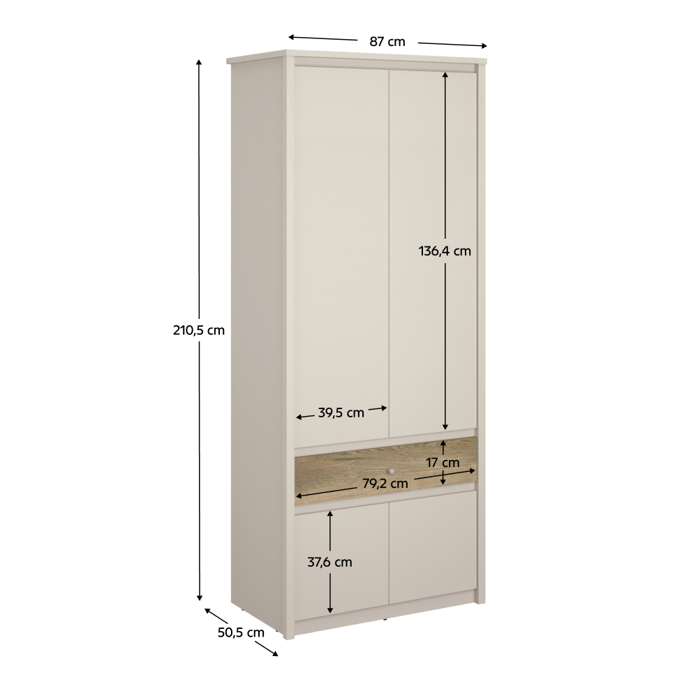 Materiál: laminovaná DTD Barva: kašmír/dub evoke Rozměry (ŠxHxV): 87x50,5x210,5 cm Tloušťka materiálu DTD: 1,6-3,2 cm Čtyřdveřová věšáková tyč Nosnost věšákové tyče: 5 kg Zásuvka S úchytkou Materiál úchytky: plast Barva úchytky: kašmír Nosnost zásuvky: 3 kg Skříňka Bez úchytky Šikmý zářez Barva sololitu: bílá Kluzáky Výška kluzáků: 0,3 cm Moderní design Doporučujeme připevnit ke stěně Dodáváno v demontu