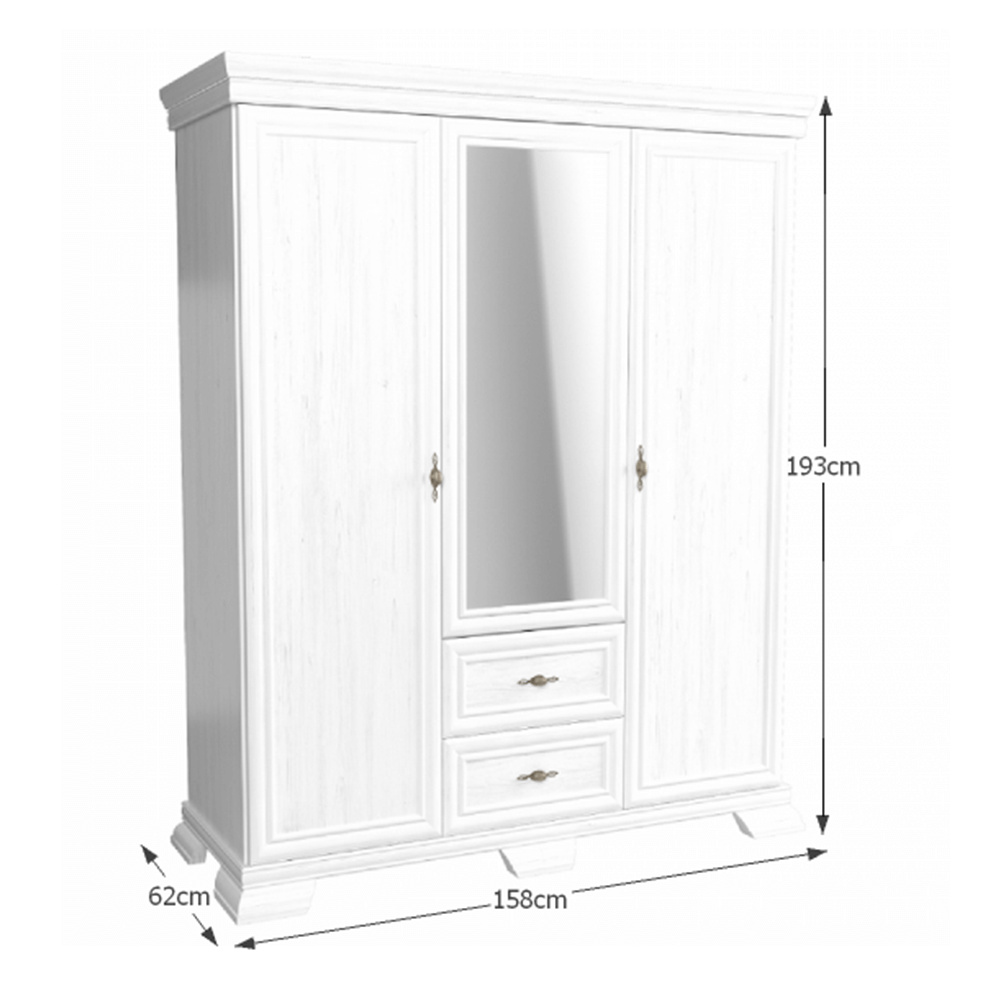 Skříň KS2 KORA NEW. Barevné provedení sosna andersen. Materiál laminovaná DTD, MDF, sklo, kov. Materiál: laminovaná DTD/MDF Barva: sosna andersen Rozměry (ŠxHxV): 158x62x193 cm Tloušťka materiálu korpus: 15 mm Tloušťka materiálu vrchní desky: 22 mm Tloušťka materiálu dolní desky: 22 mm Výška spodního prostoru od podlahy: 10,5 cm Rustikální styl Ozdobné lišty Kovové úchytky Boční skříňky jsou věšákové Dvě police ve střední části Střední část se zrcadlem Dva šuplíky Dodáváno v demontu