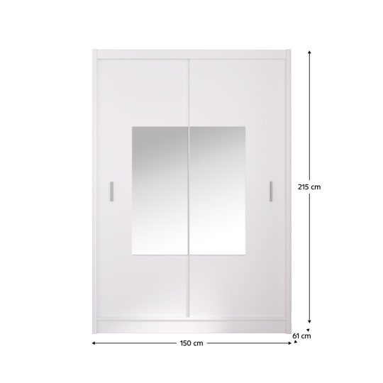 Materiál: DTD laminovaná/ABS hrany/lišty MDF fóliovaná/sklo Barva: bílá Rozměry (ŠxHxV): 150x61x215 cm Tloušťka materiálu DTD: 1,6 cm S plastovými úchytkami Barva úchytek: stříbrná Tvar úchytek: obdélník Se zrcadlem Dvoudveřová S posuvnými dveřmi Věšáková tyč Policová část Nosnost police: 5 kg Nosnost věšáku: 5 kg Moderní design Není vhodné zatěžovat vrchní desku Dovávaná v demontu