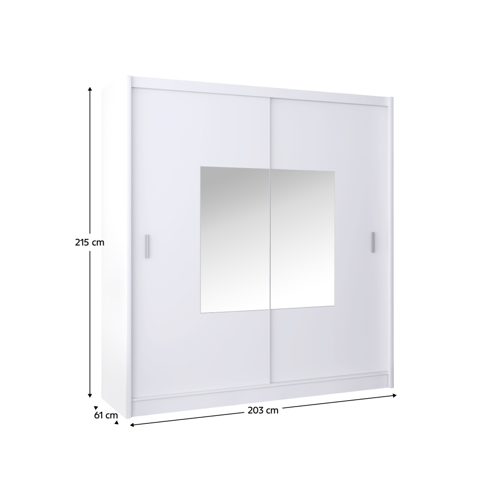 Materiál: DTD laminovaná/ABS hrany/lišty MDF fóliovaná/sklo Barva: bílá Rozměry (ŠxHxV): 203x61x215 cm Tloušťka materiálu DTD: 1,6 cm S plastovými úchytkami Barva úchytek: stříbrná Tvar úchytek: obdélník Se zrcadlem Dvoudveřová S posuvnými dveřmi Věšáková tyč Policová část Nosnost police: 5 kg Nosnost věšáku: 5 kg Moderní design Není vhodné zatěžovat vrchní desku Dovávaná v demontu