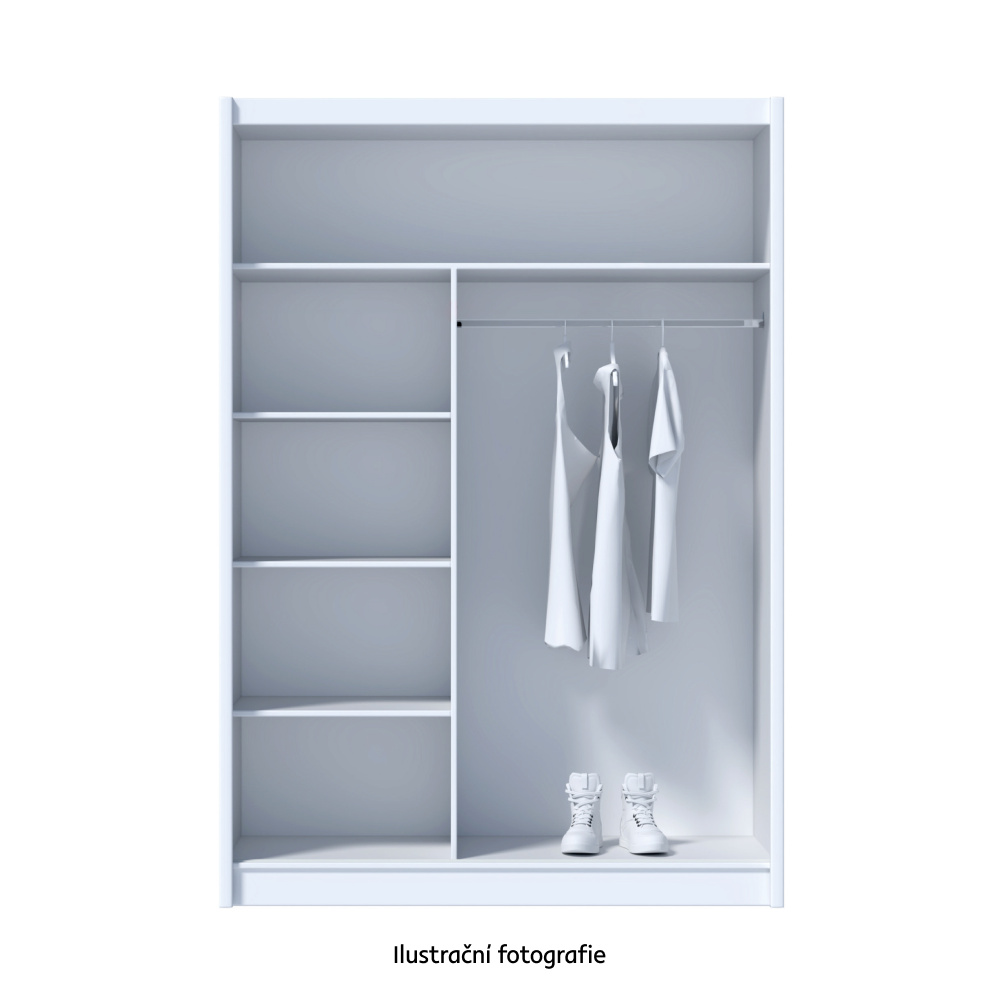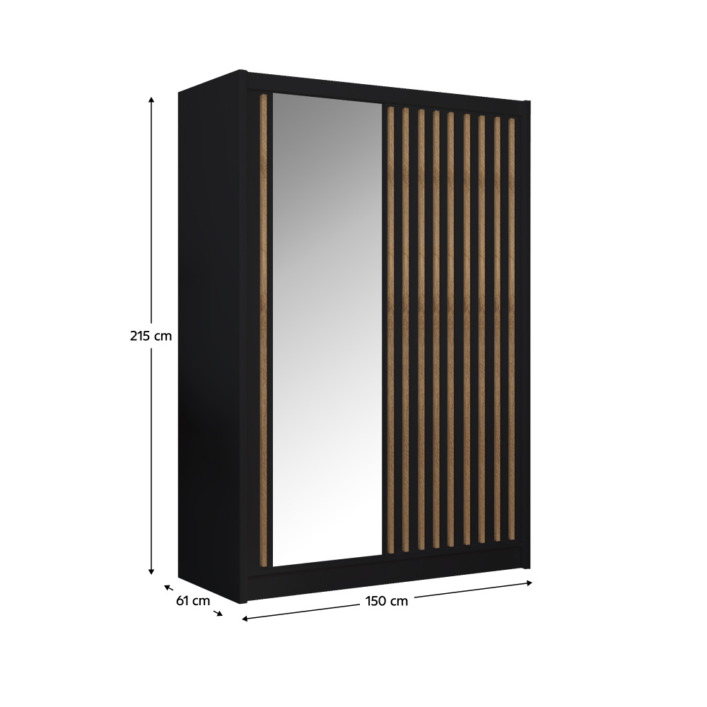 Materiál: DTD laminovaná/ABS hrany/MDF lišty fóliovaná/sklo Barva: černá/dub craft Rozměry (ŠxHxV): 150x61x215 cm Tloušťka DTD: 1,6 cm Tloušťka lamely: 2,5 cm Tloušťka ABS: 0,045 cm Nosnost police: 5 kg Nosnost věšáku: 5 kg S posuvnými dveřmi Posuvné dveře jsou univerzální Se zrcadlem Policová část Věšáková část Dvoudveřová Není vhodné zatěžovat vrchní desku Dodáváno v demontu