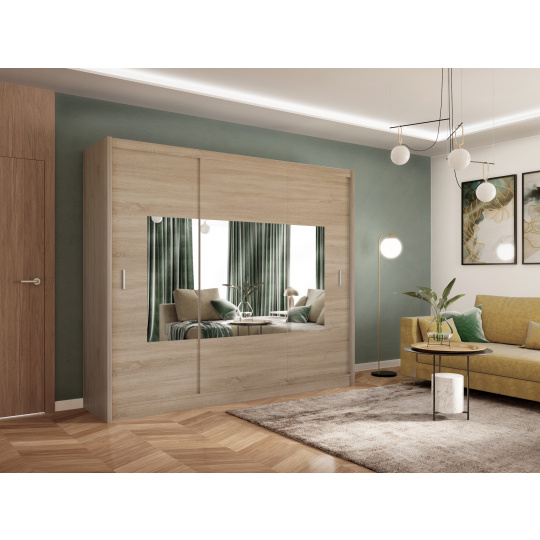 Materiál: DTD laminovaná/ABS hrany/lišty MDF fóliovaná/sklo Barva: dub sonoma Rozměry (ŠxHxV): 250x61x215 cm Tloušťka materiálu DTD: 1,6 cm S plastovými úchytkami Barva úchytek: stříbrná Tvar úchytek: obdélník Se zrcadlem Třídveřová S posuvnými dveřmi Věšáková tyč Nosnost věšákové tyče: 5 kg Policová část Nosnost police: 5 kg Šuplíky Nosnost šuplíku: 3 kg Moderní design Není vhodné zatěžovat vrchní desku Dovávaná v demontu