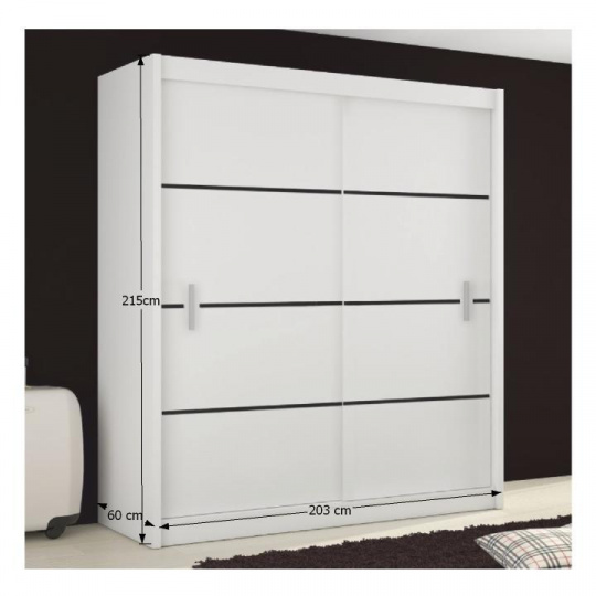Skříň s dvěma posuvnými dveřmi Merina Barevné provedení: černá / bílá Materiál: DTD laminovaná/MDF fóliovaná, Rozměry (ŠxHxV): 203x60x215 cm Tloušťka materiálu: 16 mm Nosnost police: 5 kg Nosnost věšáku: 5 kg Není vhodné zatěžovat vrchní desku Dodávána v demontu