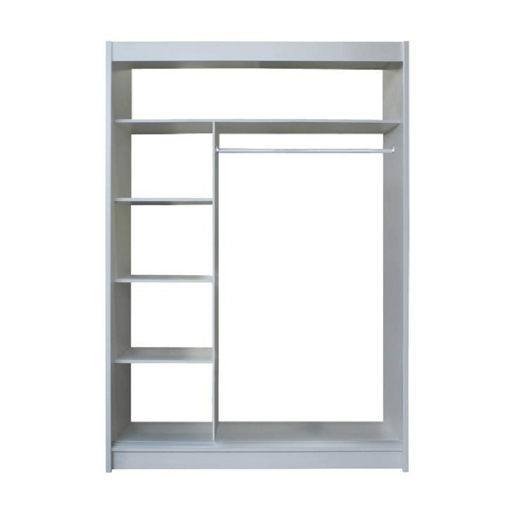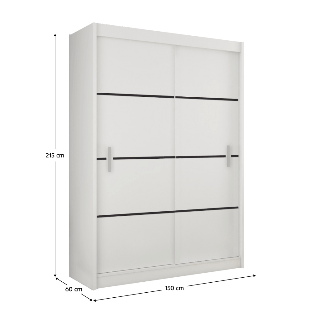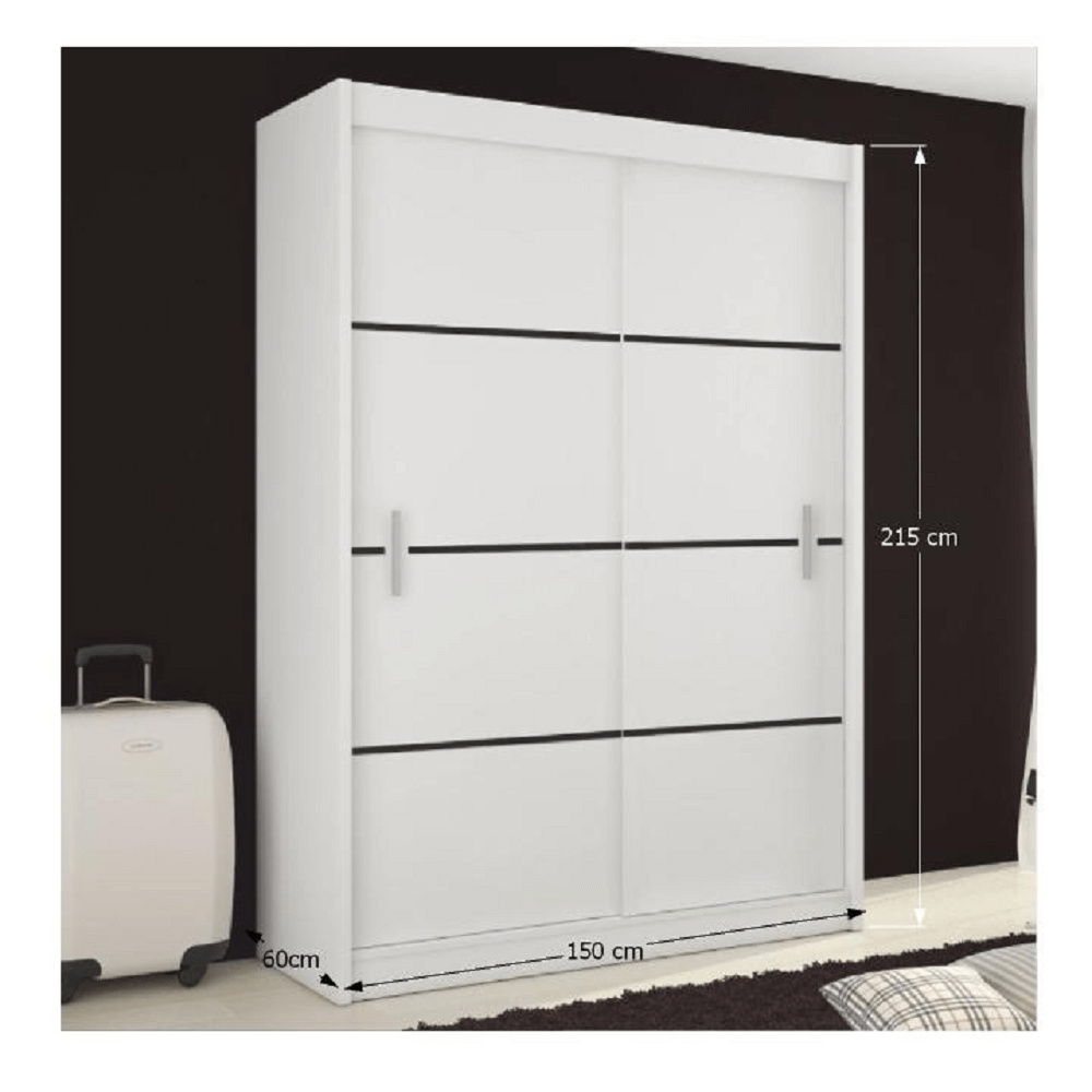 Skříň s dvěma posuvnými dveřmi Merina Barevné provedení: černá / bílá Materiál: DTD laminovaná/MDF fóliovaná, Rozměry (ŠxHxV): 150x60x215 cm Tloušťka materiálu: 16 mm Nosnost police: 5 kg Nosnost věšáku: 5 kg Není vhodné zatěžovat vrchní desku Dodávána v demontu