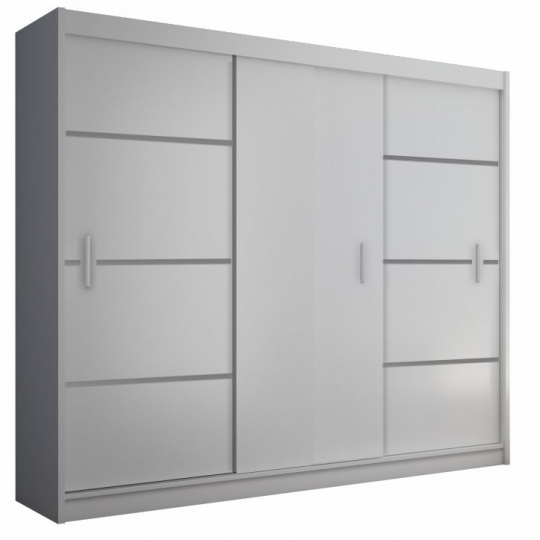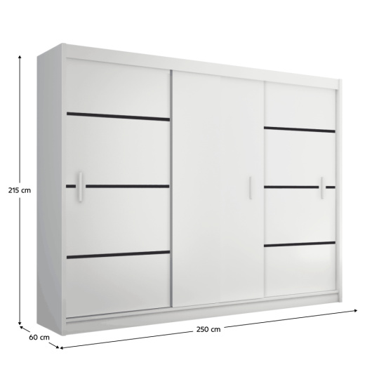 Skříň s dvěma posuvnými dveřmi Merina Barevné provedení: bílá / černá Materiál: DTD laminovaná/MDF fóliovaná, Rozměry (ŠxHxV): 250x60x215 cm Tloušťka materiálu: 16 mm Nosnost šuplíku: 3 kg Nosnost police: 5 kg Nosnost věšáku: 5 kg Není vhodné zatěžovat vrchní desku Dodávána v demontu
