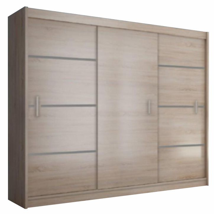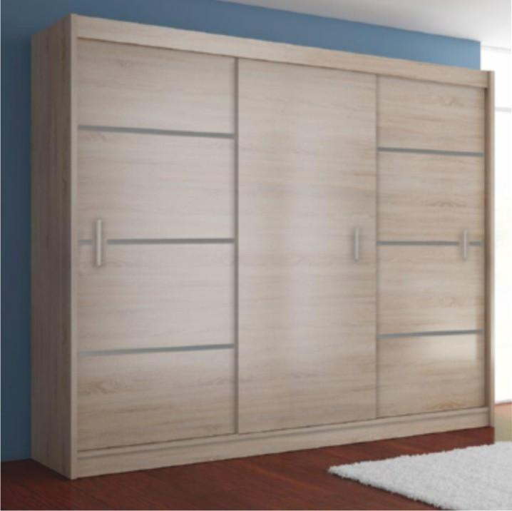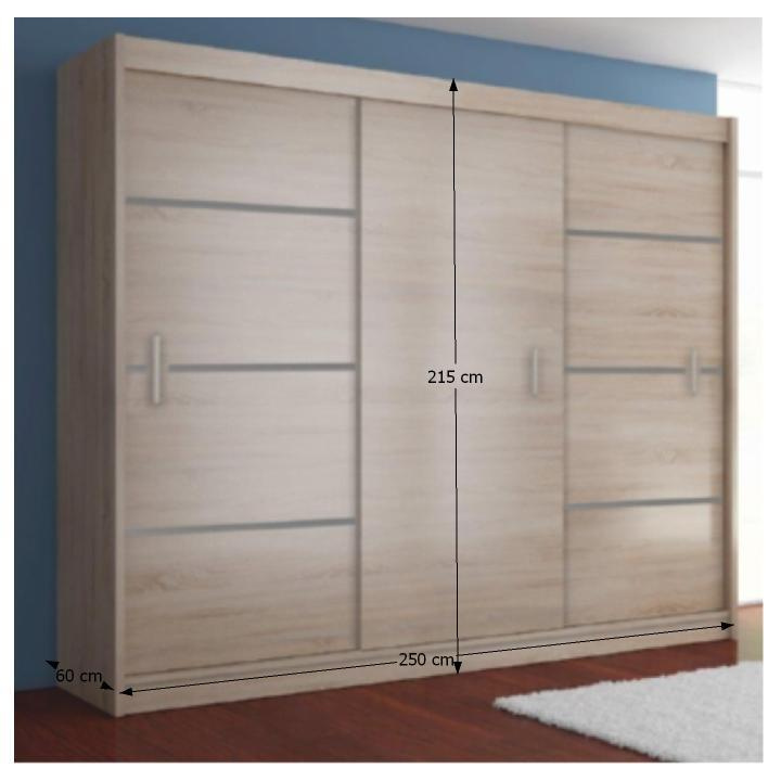 Skříň s dvěma posuvnými dveřmi Merina Barevné provedení: dub sonoma / šedá Materiál: DTD laminovaná/MDF fóliovaná, Rozměry (ŠxHxV): 250x60x215 cm Tloušťka materiálu: 16 mm Nosnost šuplíku: 3 kg Nosnost police: 5 kg Nosnost věšáku: 5 kg Není vhodné zatěžovat vrchní desku Dodávána v demontu