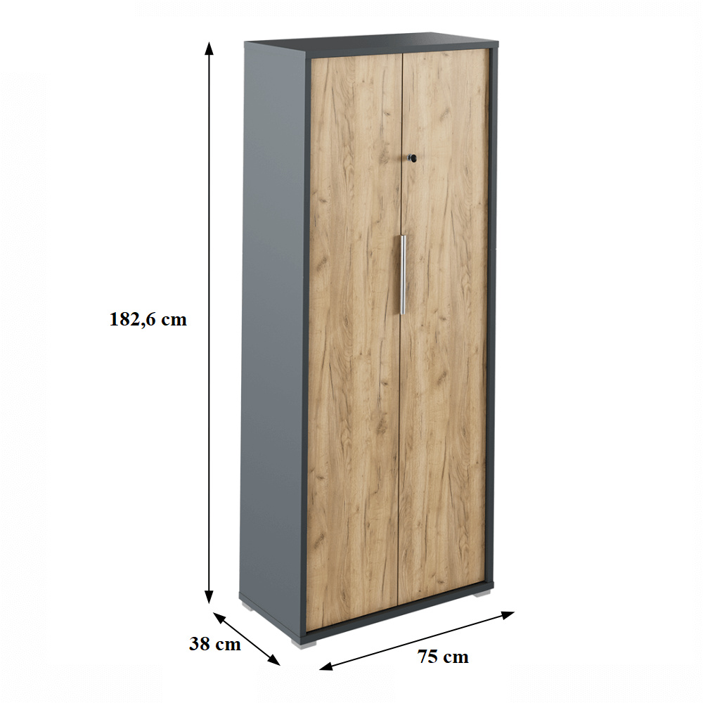 Skříňka RIOMA NEW TYP 31 Barevné provedení: grafit / dub artisan Materiál: DTD laminovaná Rozměry (ŠxHxV): 75x38x182,6 cm Tloušťka materiálu: 16/22 mm věšáková S věšákovou tyčí policová se zámkem Dodávané v demontu.