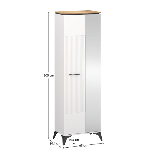 Materiál: laminovaná DTD/fóliovaná MDF/PVC Barva: bílá/dub evoke Rozměry (ŠxHxV): 63x39,4x205 cm Tloušťka materiálu: 1,6 cm Jednodveřová Se zrcadlem Police Výsuvná věšáková tyč Nosnost police: 3 kg Kovové úchytky Barva úchytek: černá Kovové nožičky Barva nožiček: černá Výška nožiček: 14,5 cm Dekorativní rýhovaná dvířka Moderní design Doporučujeme připevnit ke zdi Dodáváno v demontu