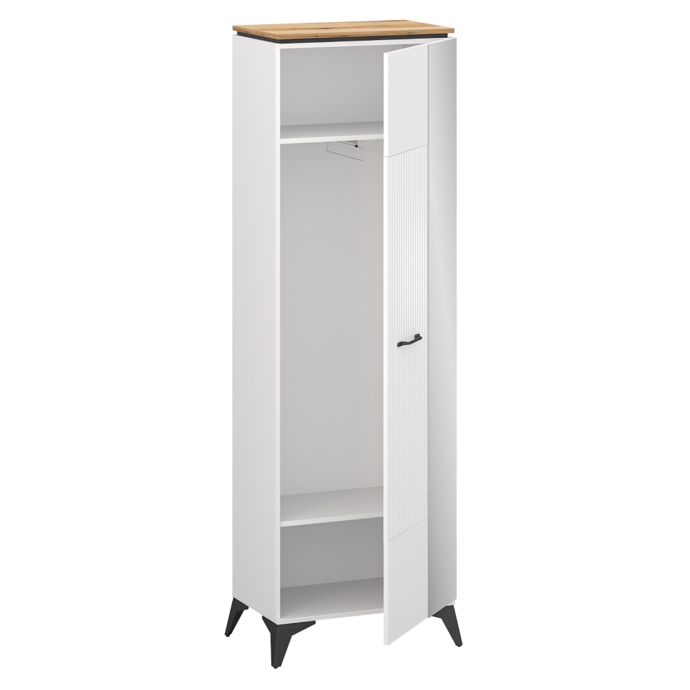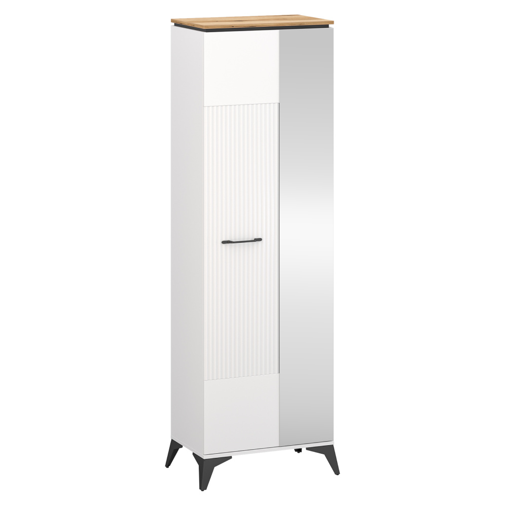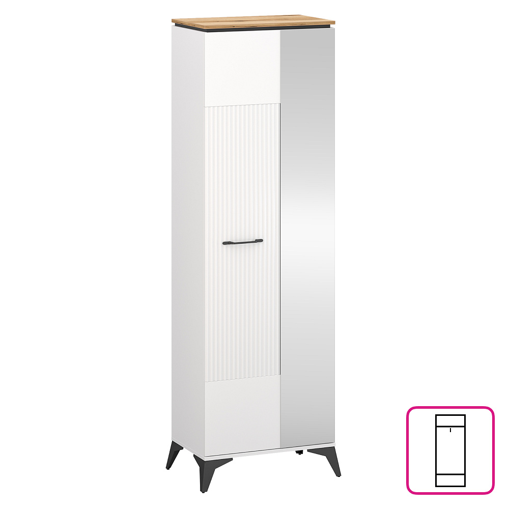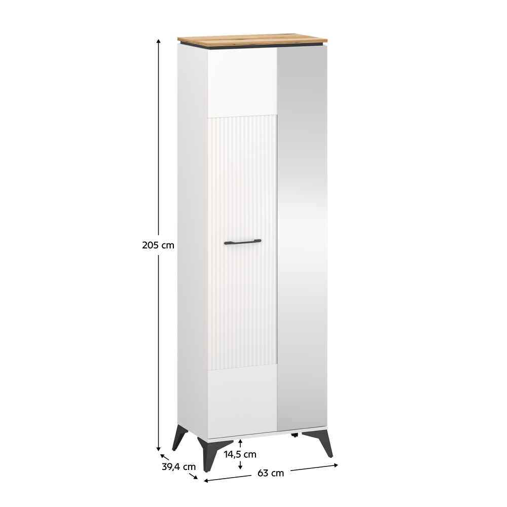 Materiál: laminovaná DTD/fóliovaná MDF/PVC Barva: bílá/dub evoke Rozměry (ŠxHxV): 63x39,4x205 cm Tloušťka materiálu: 1,6 cm Jednodveřová Se zrcadlem Police Výsuvná věšáková tyč Nosnost police: 3 kg Kovové úchytky Barva úchytek: černá Kovové nožičky Barva nožiček: černá Výška nožiček: 14,5 cm Dekorativní rýhovaná dvířka Moderní design Doporučujeme připevnit ke zdi Dodáváno v demontu