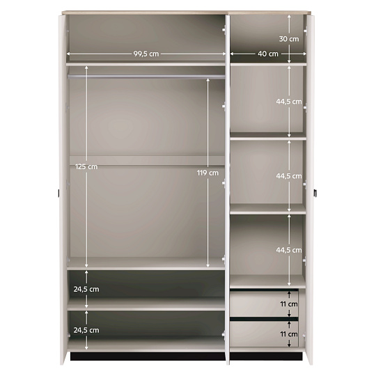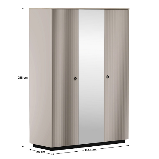 Materiál: laminovaná DTD/fóliovaná MDF/sklo Barva: šedohnědá Taupe/dub silverjack Rozměry (ŠxHxV): 153,5x60x218 cm Tloušťka materiálu DTD: 1,6-1,8 cm Tloušťka materiálu MDF: 1,9 cm Třídveřová Se zrcadlem Policová Věšáková tyč Dvě zásuvky Nosnost police: 5 kg Nosnost zásuvky: 3 kg S úchytkami Materiál úchytek: kov Barva úchytek: matná černá Na nožičkách Výška nožiček: 12 cm Materiál nožiček: plast Barva nožiček: matná černá Dekorativní frézovaná dvířka Moderní design Doporučujeme připevnit ke zdi Dodáváno v demontu