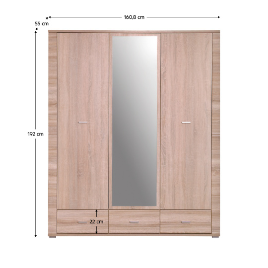 Skříň věšáková typ 02, se třemi policemi a třemi zásuvkami, vhodná na zařízení obývacích pokojů, ložnic i pracoven, materiál: DTD laminovaná. Hrany jednotlivých komponentů jsou ukončeny vroubkovanou lištou. Barevné provedení: dub sonoma. Rozměry (ŠxVxH): 160,8x192x55 cm. Tloušťka materiálu korpus: 16 mm Tloušťka materiálu vrchní desky: 22 mm Tloušťka materiálu spodní desky: 22 mm Dodávána v demontu, pouze na objednávku s dodací lhůtou 5-7 týdnů.
